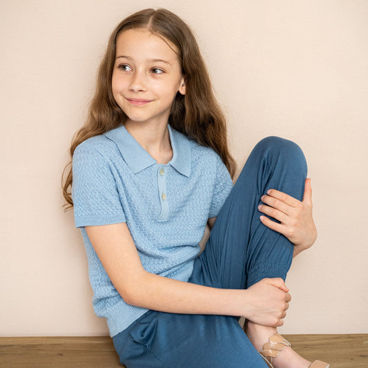 Oxford silk-cashmere cable-knitted polo for kids - Sky