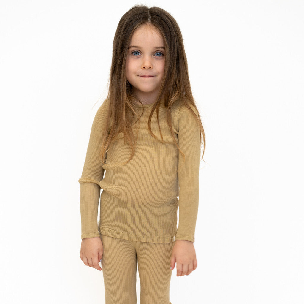Bluse med rund hals og lange ærmer i blød merinould. Denne bluse er sømløs og har en dobbeltstikning rib, som giver et smukt lige look, når den bæres. Velegnet til drenge og piger. Brug den som et ekstra termisk lag eller sammen med Arona leggings for et varmt og blødt pyjamas. Garanteret at holde dit barn varmt og hyggeligt hele vinteren.