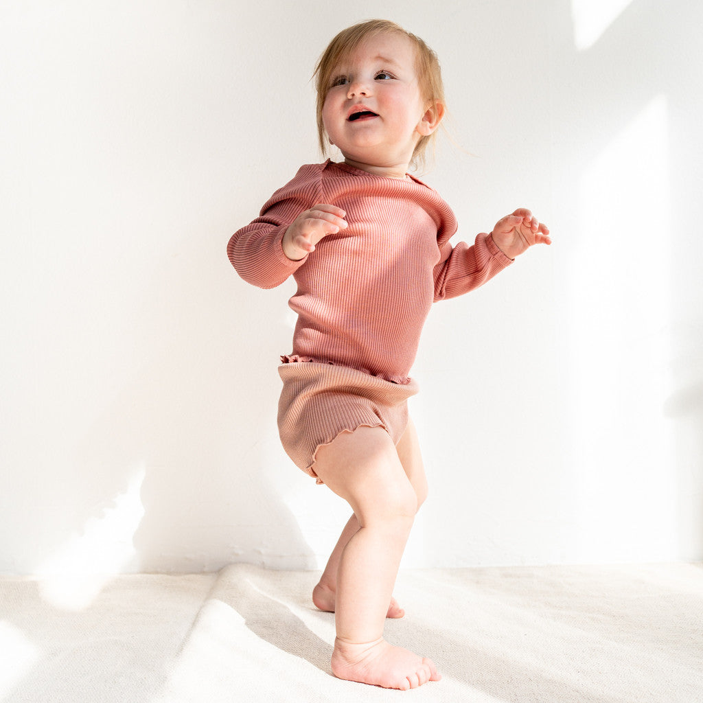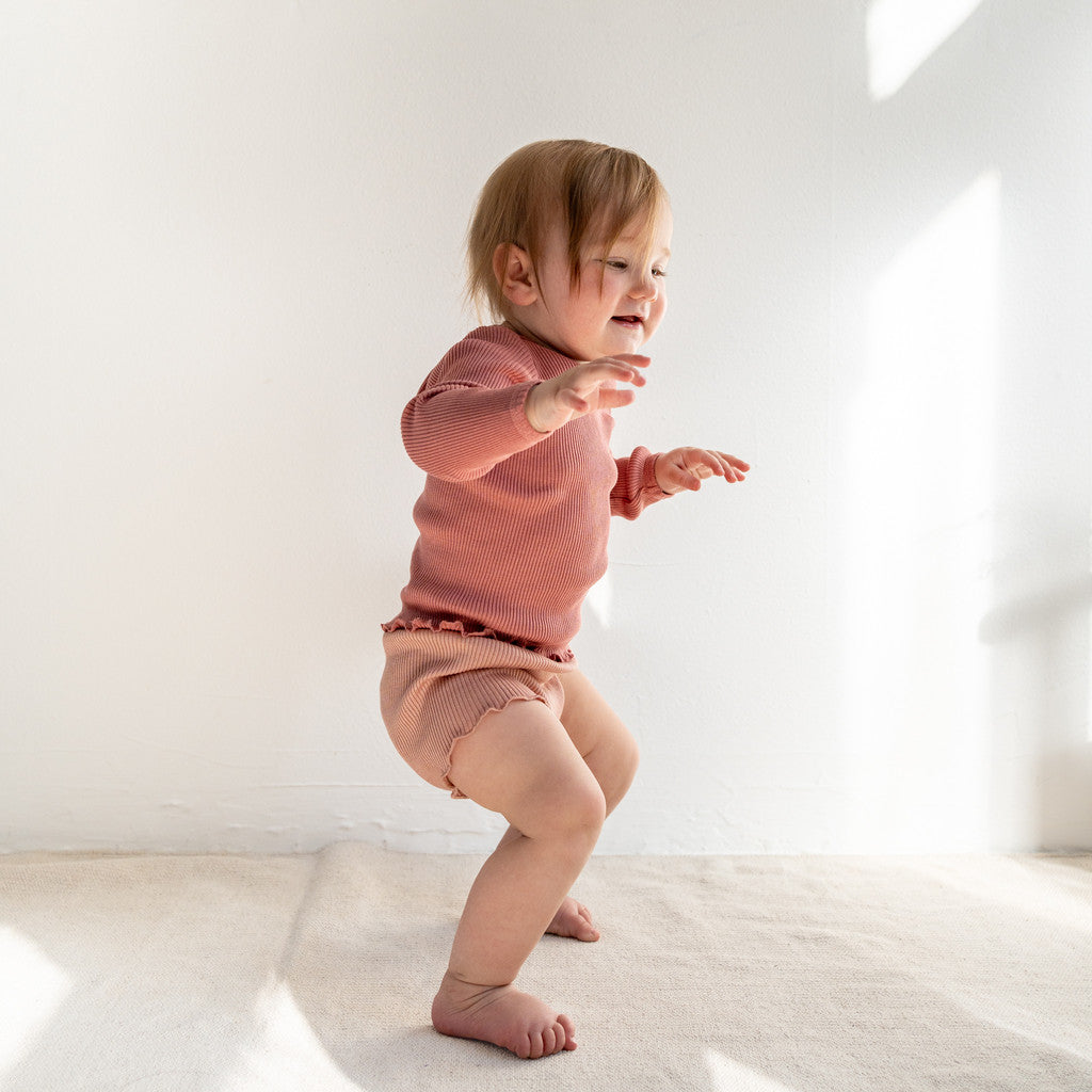 Skønne baby bloomers lavet i strækbart, blødt sømløst silke. Meget fleksible med en kropsnær pasform. Den nederste kant har flæser.