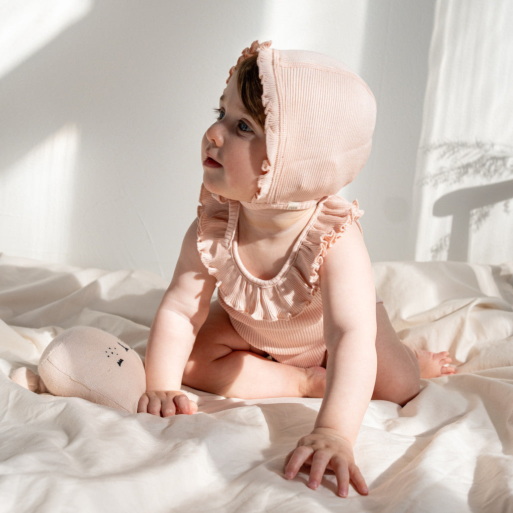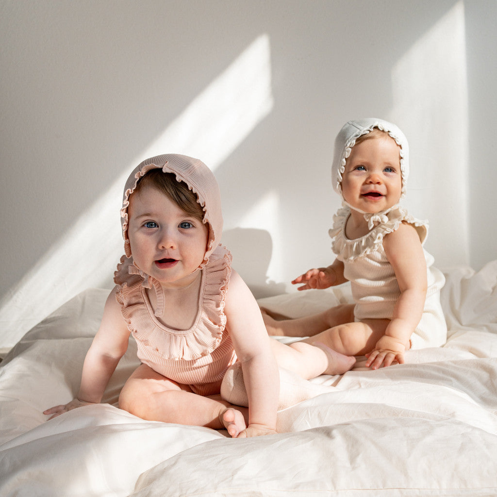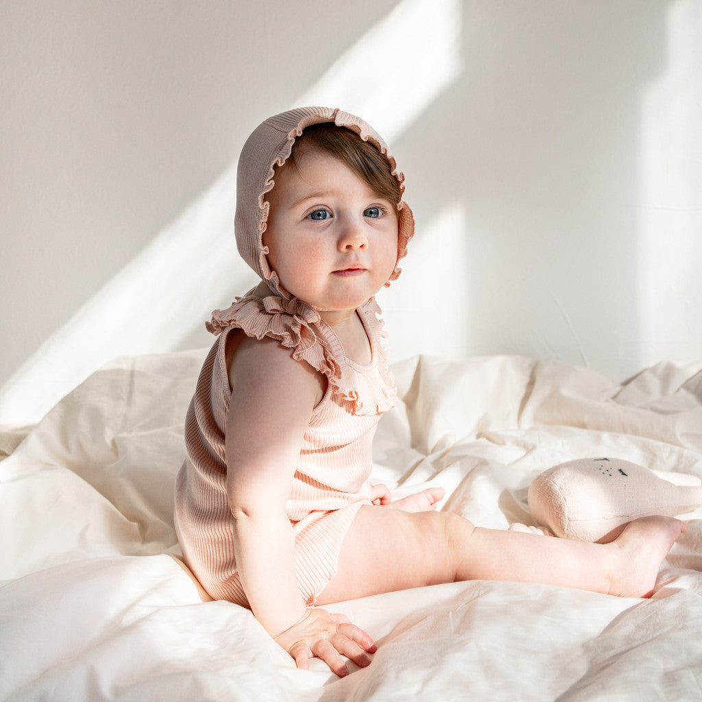Ærmeløs body med rund hals, lavet i strækbar, blød og sømløs silke. Meget fleksibel med en kropsnær pasform. Med fine flæser omkring halsudskæringen og benene.