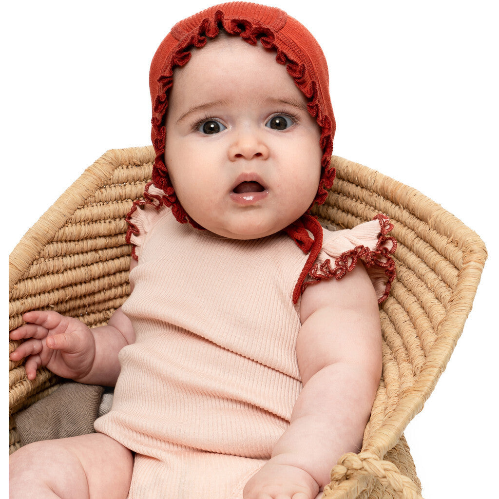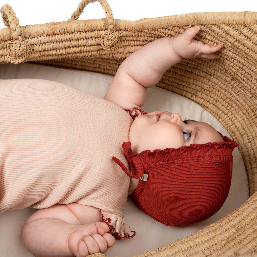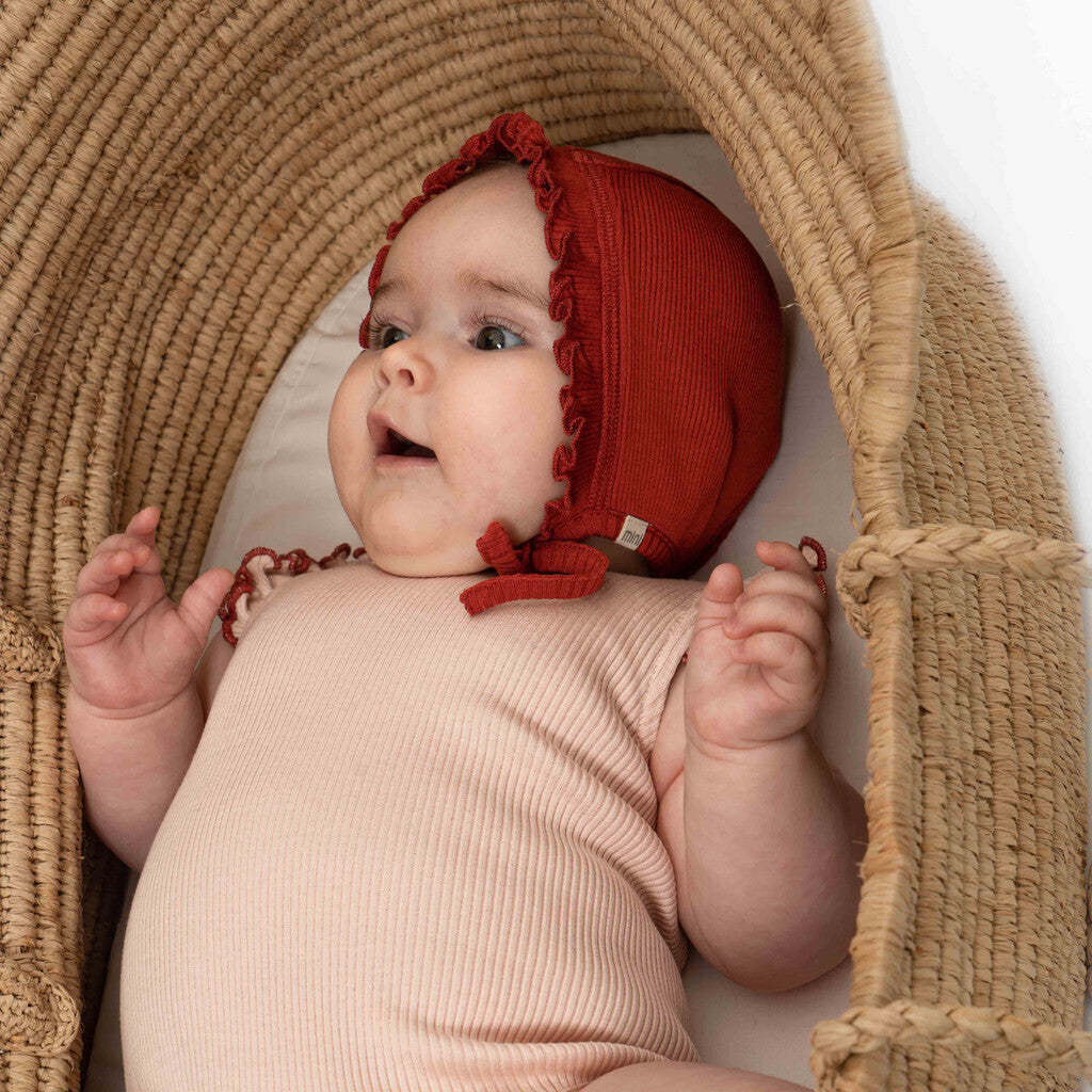 Vores bløde babyhue er lavet af en strækbar silke-bomuldsblanding og pyntet med dejlige flæser. Denne hue er designet med din babys komfort og sikkerhed i tankerne, og har stropper, der er begrænset til 14 cm, i overensstemmelse med EU-standarden for børnesikkerhed.