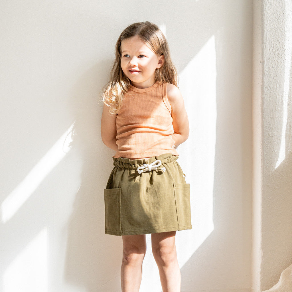 Denne charmerende papirpose-nederdel er et must-have tilføjelse til din lille ens garderobe. Nederdelen har et unikt design med store lommer og kontraststropper, der tilføjer et legende og stilfuldt touch. Flæserne langs taljen tilføjer en dejlig feminin flair. Med en elastisk talje og justerbare stropper sikrer denne nederdel en behagelig og tilpasselig pasform.