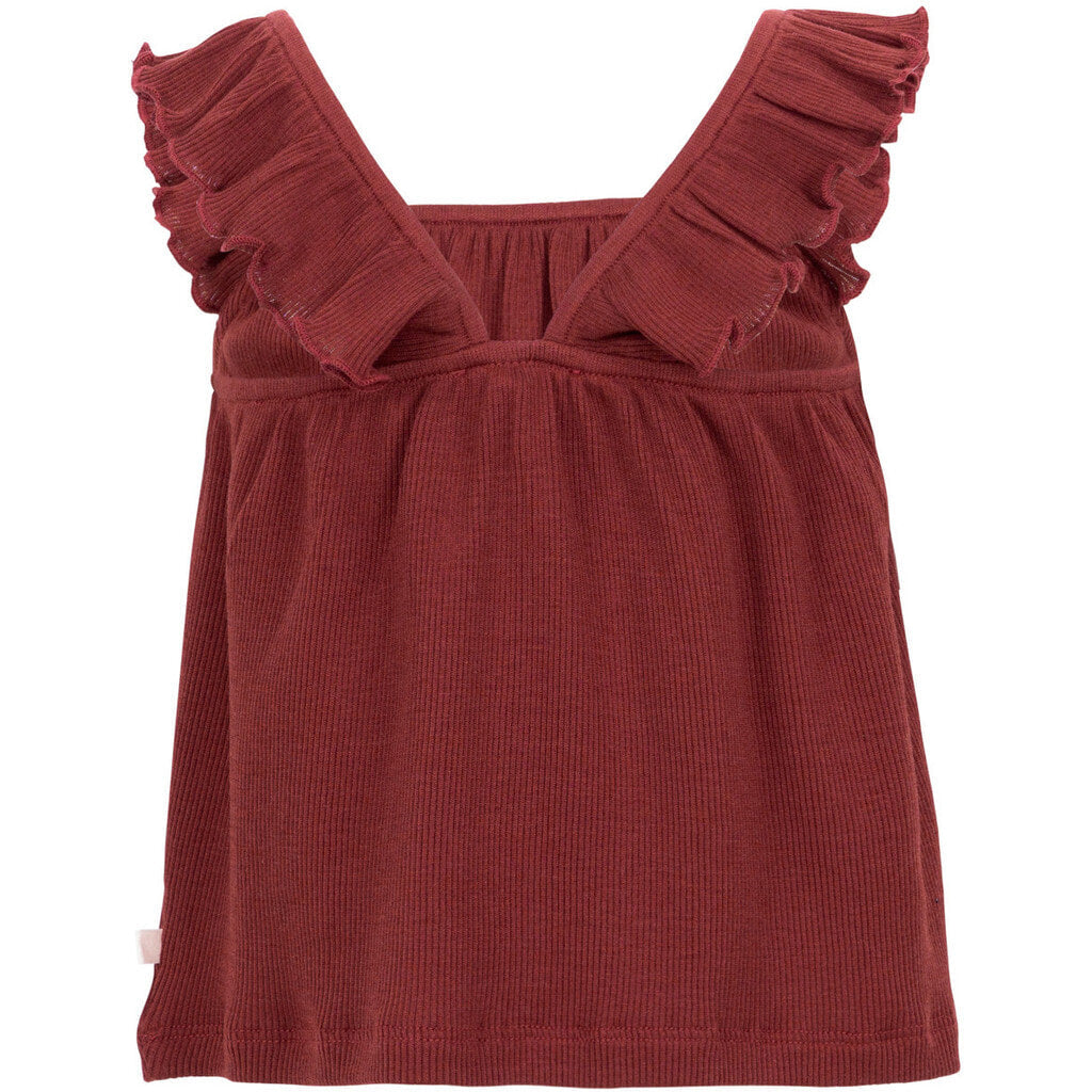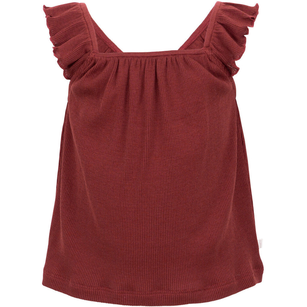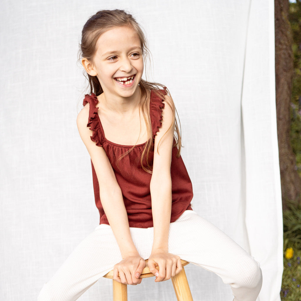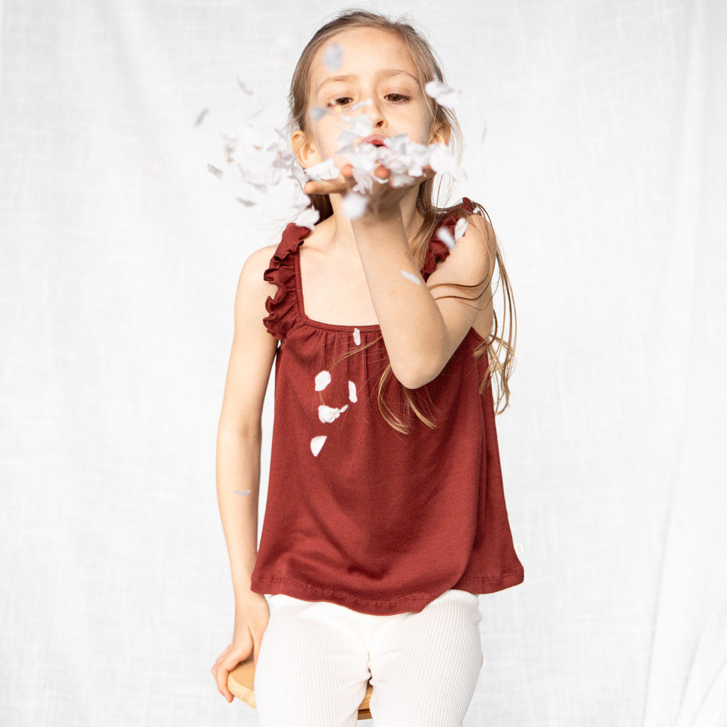 Vores smukke top i silke-bomuldsblanding har elastiske stropper med flæser, der tilføjer et feminint og legende præg. Med sin løse pasform tilbyder den en behagelig og afslappet silhuet. For et komplet og moderigtigt buksedragt-look, kombiner denne top med vores matchende Hi-bukser eller Hop-nederdel. Dette sæt er perfekt til både afslappede og festlige lejligheder.