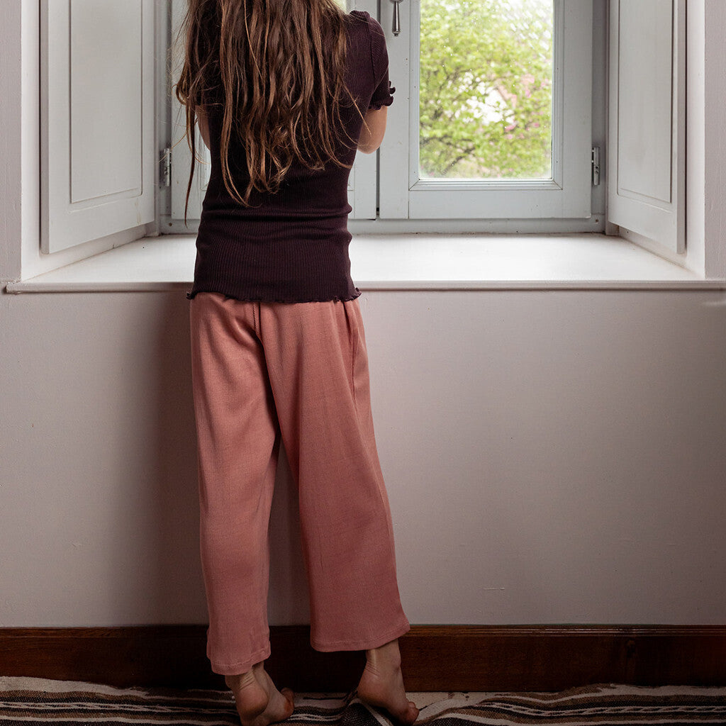 Disse cropped bukser er lavet af en let silke- og bomuldsblanding i en flydende ribbet jersey kvalitet. De har en afslappet pasform med bløde elastiske rynker i taljen og en let sænket skridt.