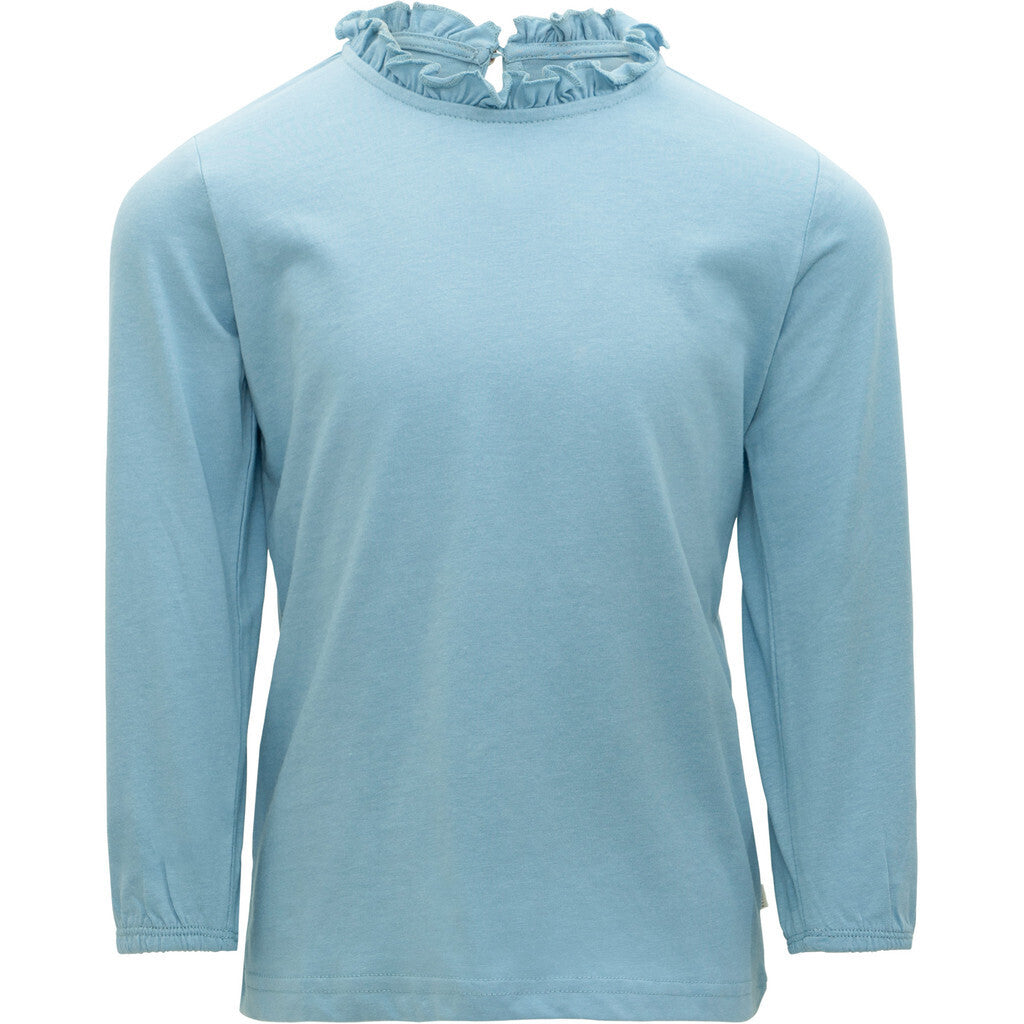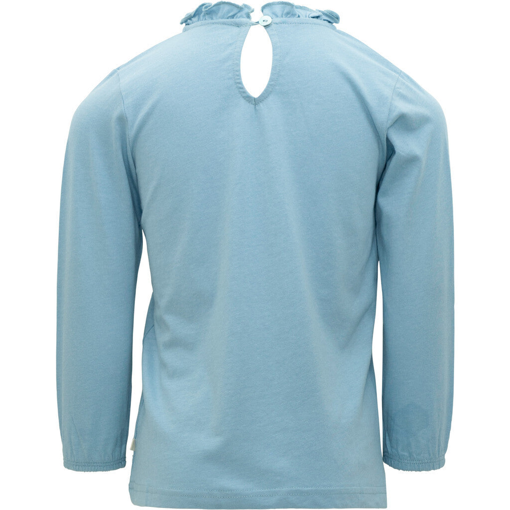 Feminin bluse til piger med korte flæser omkring halsåbningen og elastiske manchetter for at tilføje volumen til ærmerne. Lukkes bagpå med en smuk perlemorsknap. Løs pasform.
