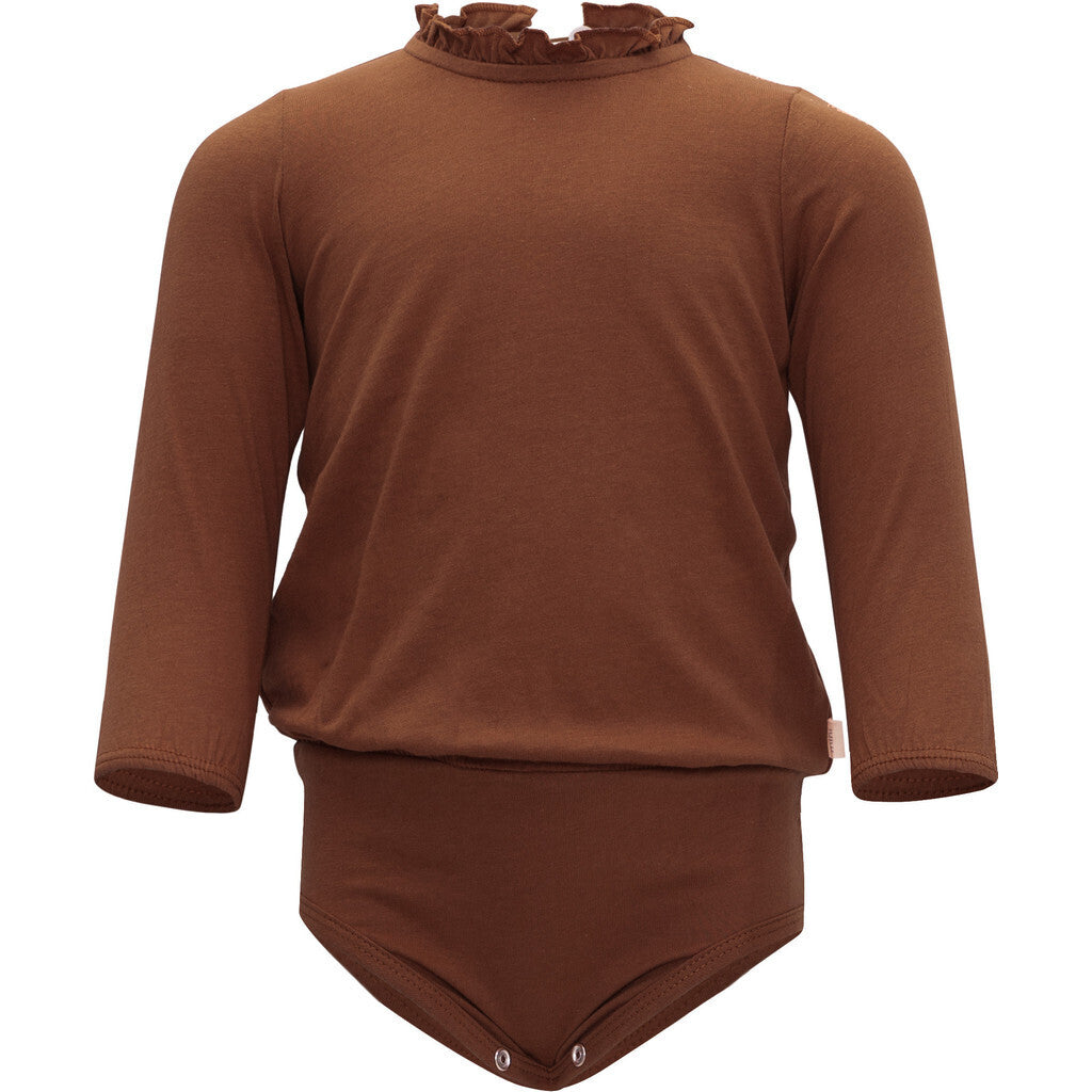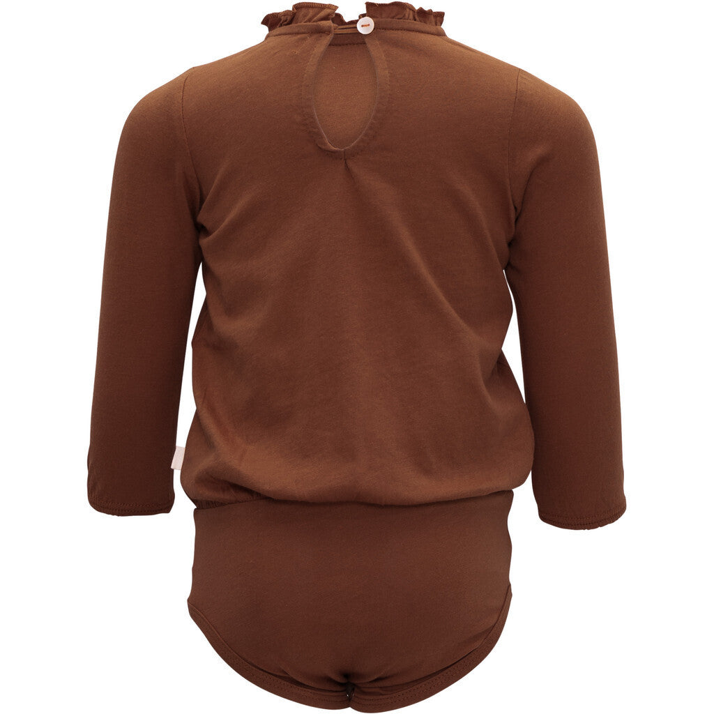 Feminint body til små piger med korte flæser omkring halsåbningen og elastiske manchetter for at tilføje volumen til ærmerne. Lukkes bagpå med en smuk perlemorsknap. Løs pasform øverst og stram pasform nederst.