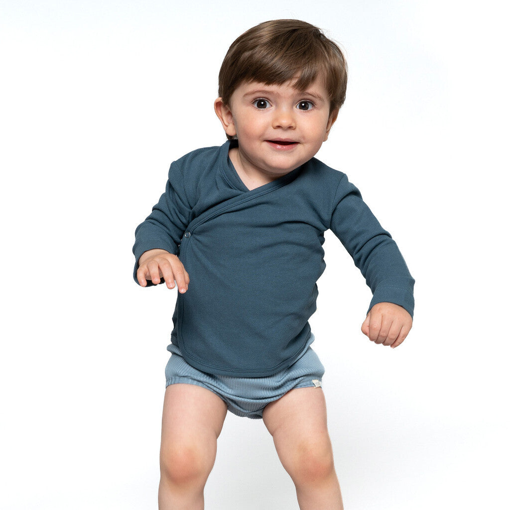 Omslagstrøje til babyer i en blød økologisk rib jersey. Nem lukning og åbning med YKK trykknapper; naturligt nikkelfri.