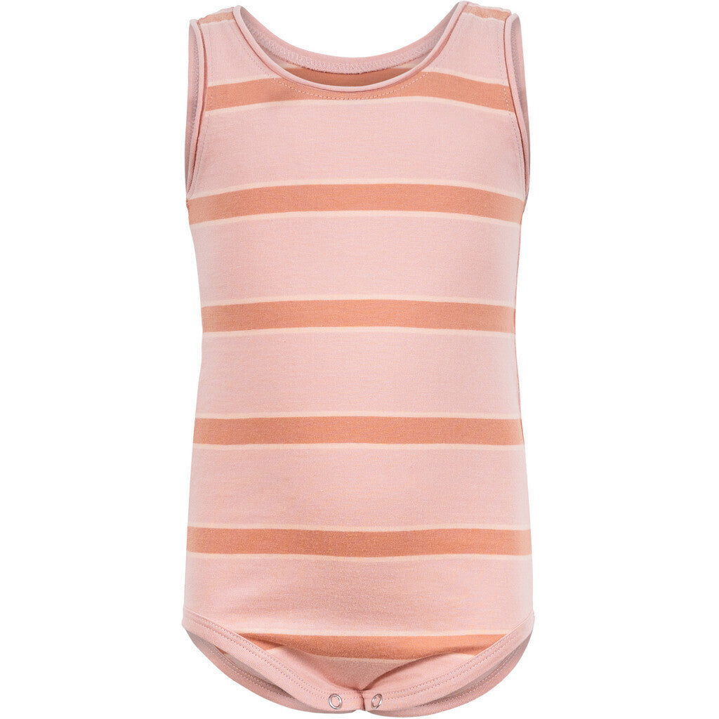 Blød body med stropper i økologisk bomuld. Ærme- og halsåbningen har rullende rå kanter. Bodyen kommer med to YKK trykknapper; naturligvis nikkelfri.