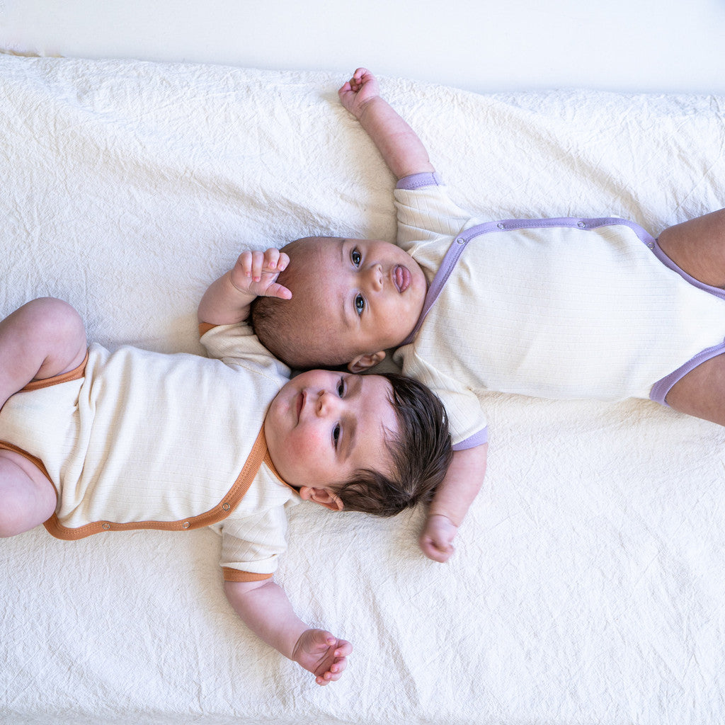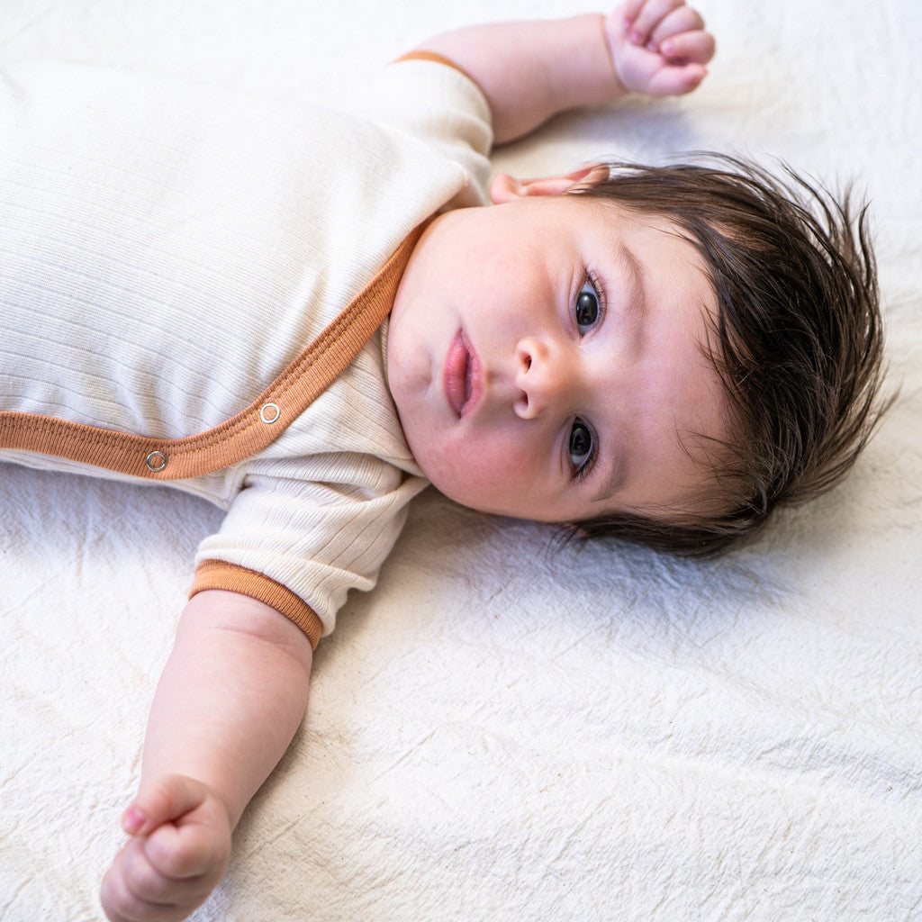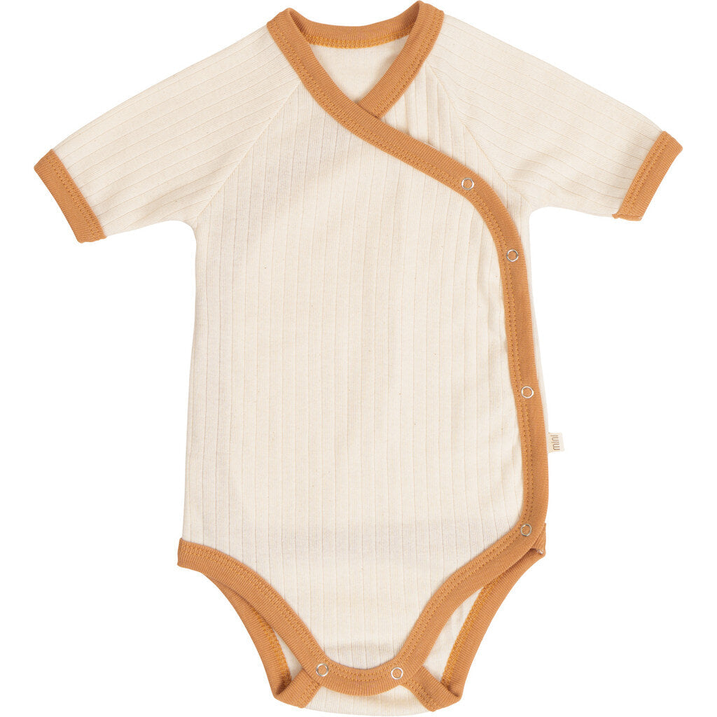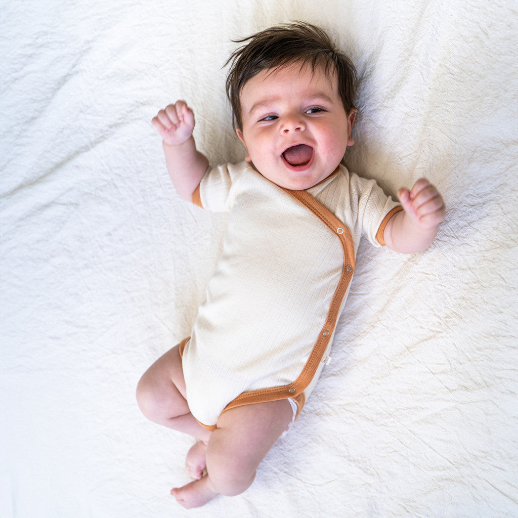 Denne kortærmede body i 100% GOTS-certificeret økologisk bomuldsjersey er et perfekt valg for dit barns komfort og velvære. Bodyen er lavet med stor omhu og har kontrastkanter omkring ærmerne og slå-om-åbningen samt YKK-trykknapper både indvendigt og udvendigt, så det bliver let som en leg at klæde dit barn på og skifte ble.