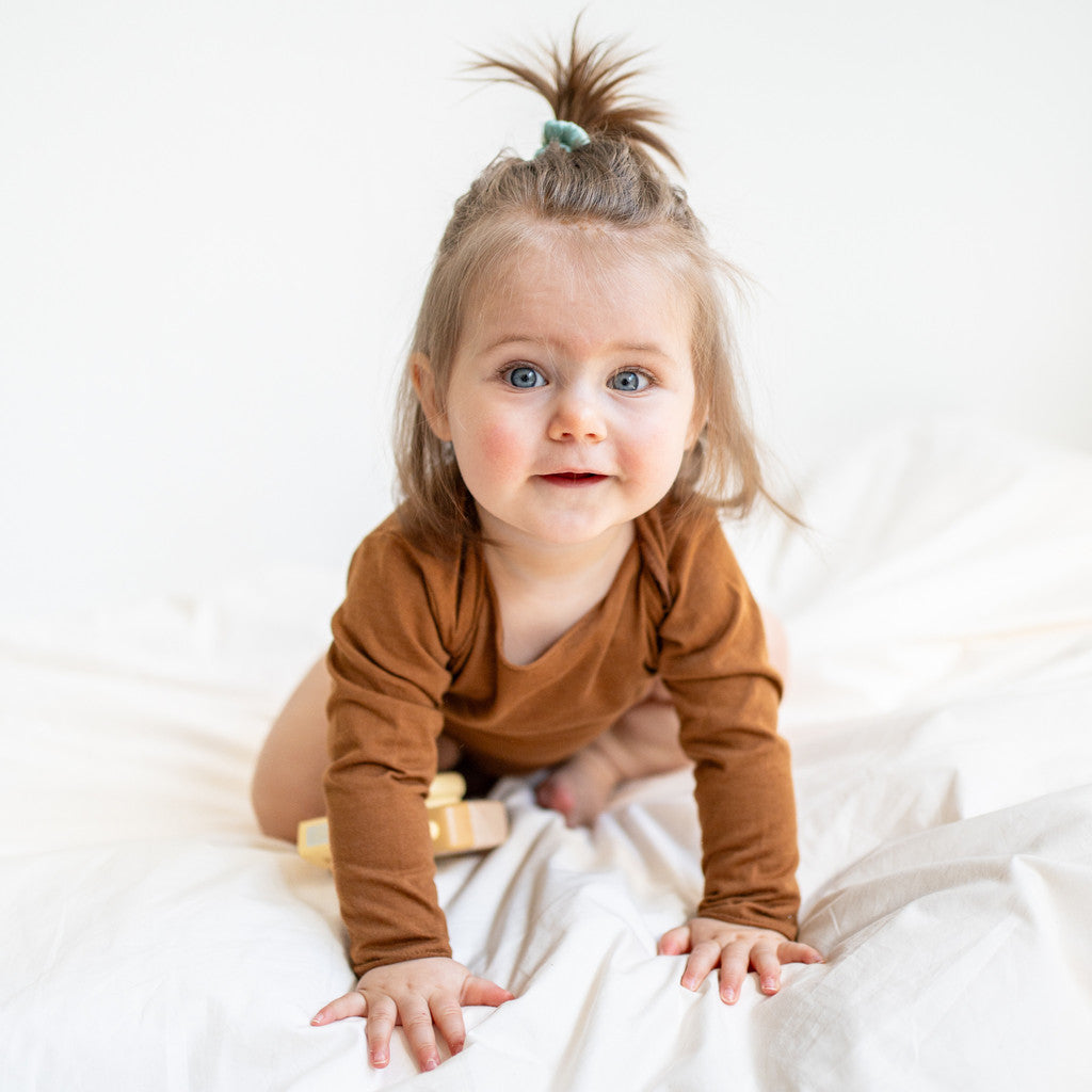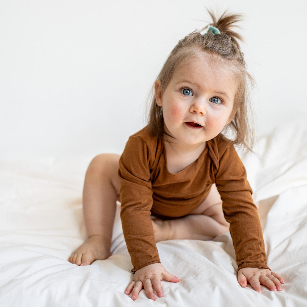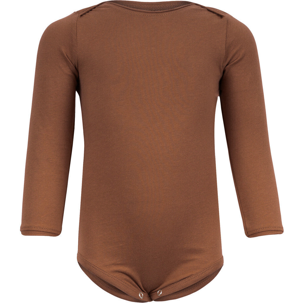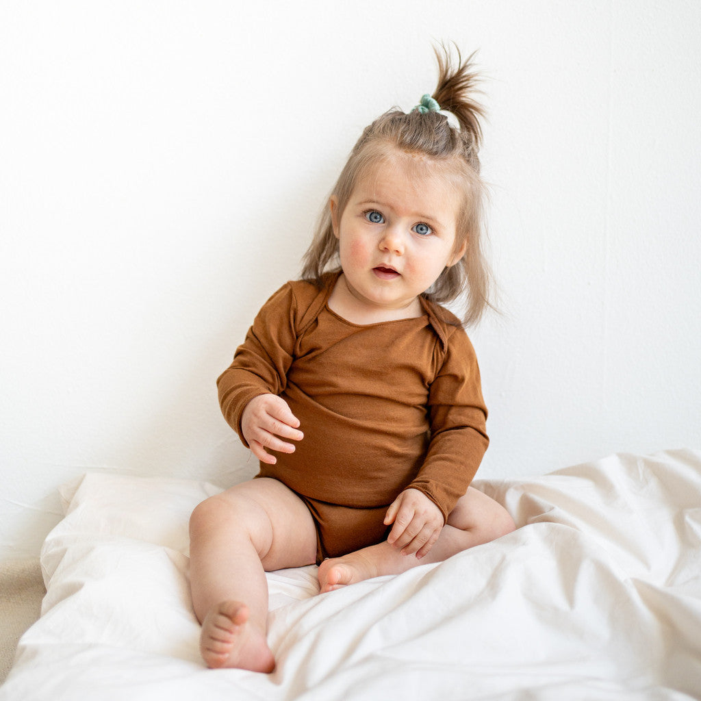 Blød langærmet body i økologisk bomuld med kuvert-halsåbning. Ærme- og halsåbningen har rullende rå kanter. Bodyen kommer med to YKK trykknapper; naturligvis nikkelfri. Stoffet har begrænset strækbarhed.