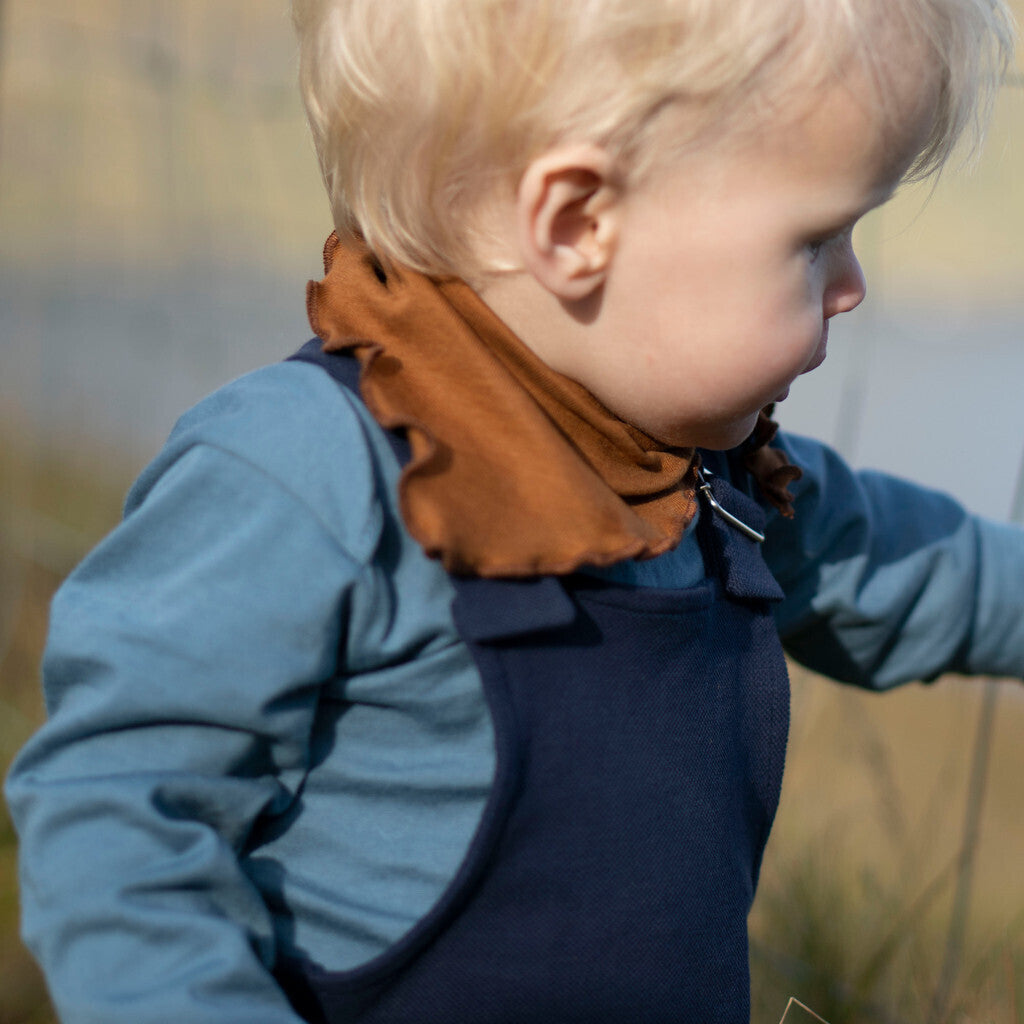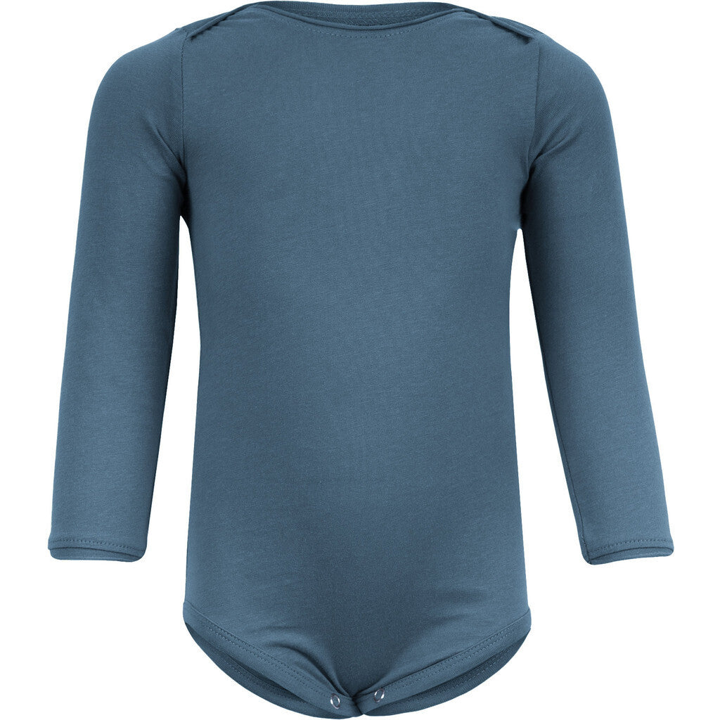 Blød langærmet body i økologisk bomuld med kuvert-halsåbning. Ærme- og halsåbningen har rullende rå kanter. Bodyen kommer med to YKK trykknapper; naturligvis nikkelfri. Stoffet har begrænset strækbarhed.
