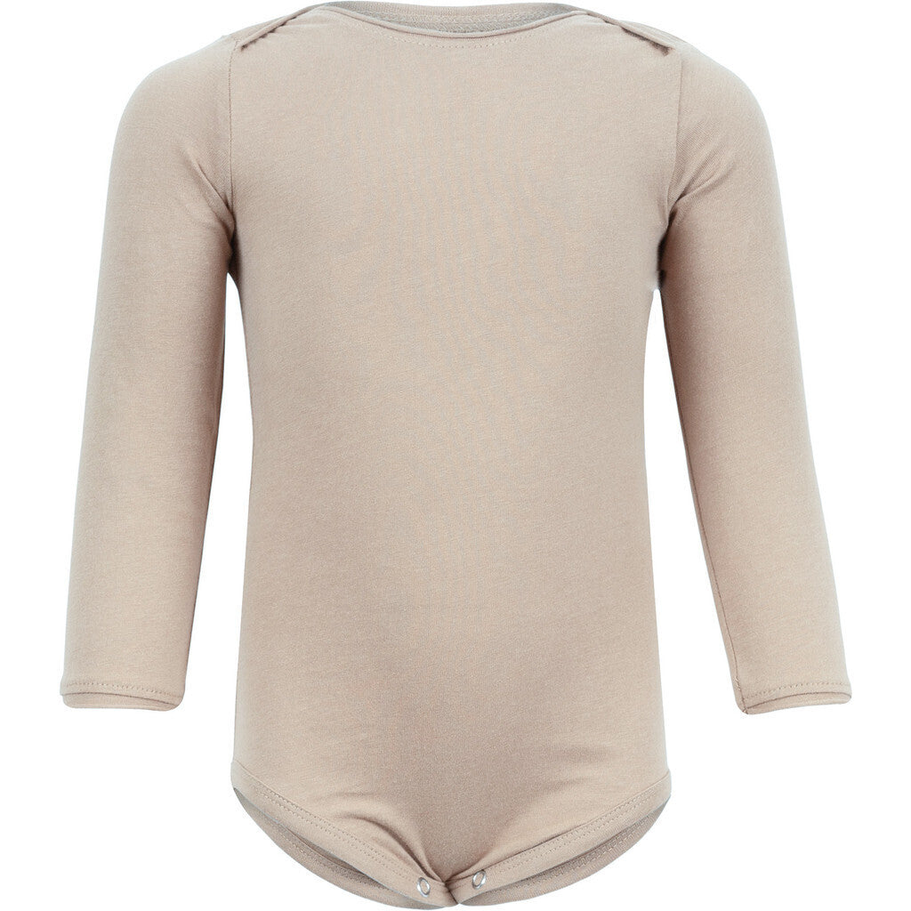 Blød langærmet body i økologisk bomuld med kuvert-halsåbning. Ærme- og halsåbningen har rullende rå kanter. Bodyen kommer med to YKK trykknapper; naturligvis nikkelfri. Denne body har samme design som stilen Norge fra tidligere kollektioner.