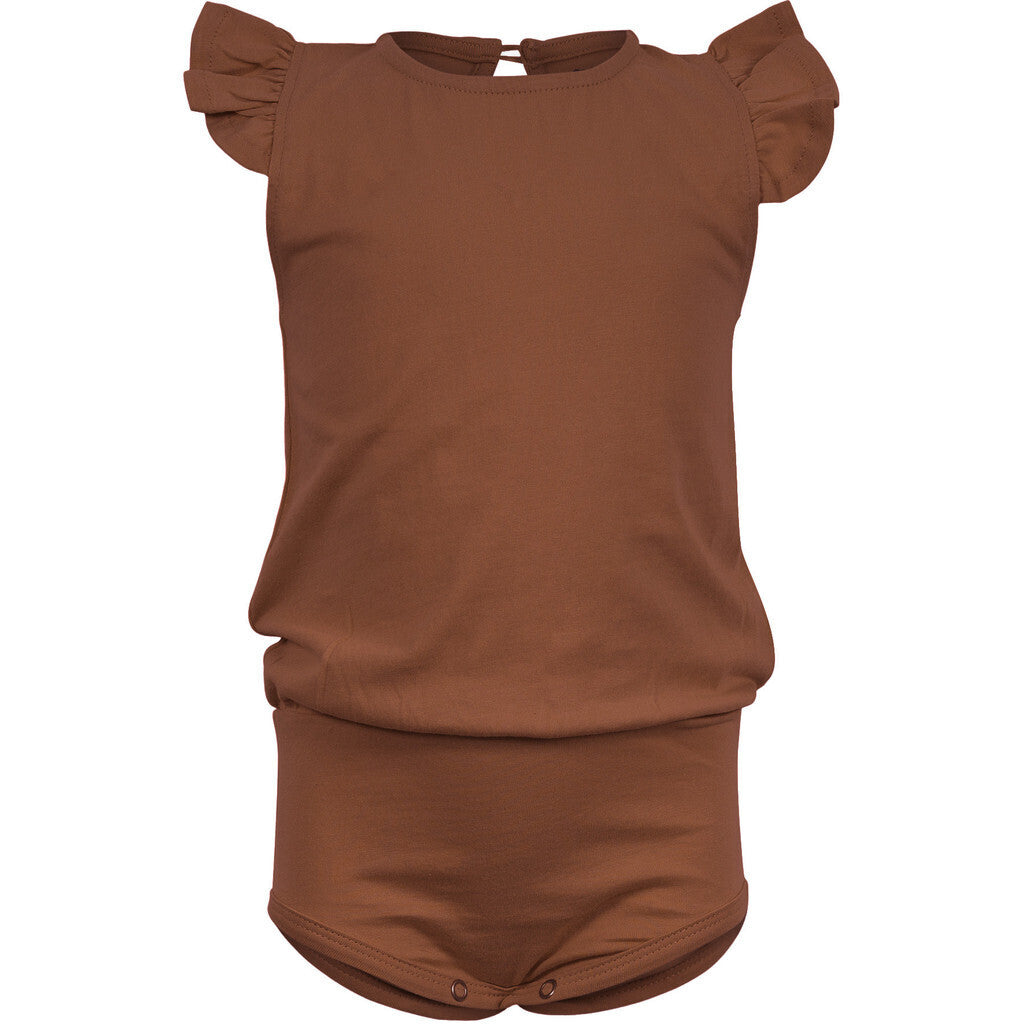 Rundhalset volumenkrop i letvægts økologisk bomuld med flæser på skuldrene for et piget look og ekstra solbeskyttelse til følsomme skuldre. En enkelt perlemorsknap i nakken for nem påklædning. Overdelen er fuld volumen med en blød talje og en slank pasform fra taljen og ned. Perfekt som romper eller stylet med en nederdel eller bukser.