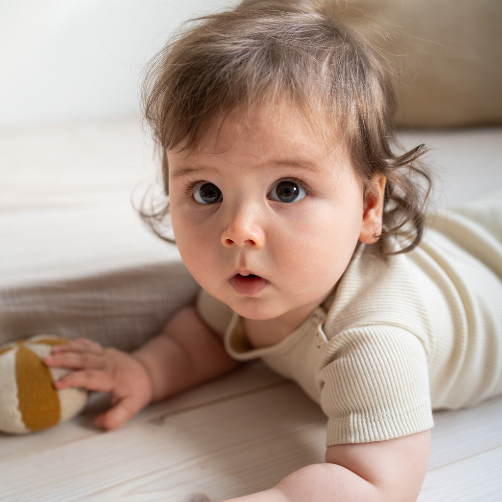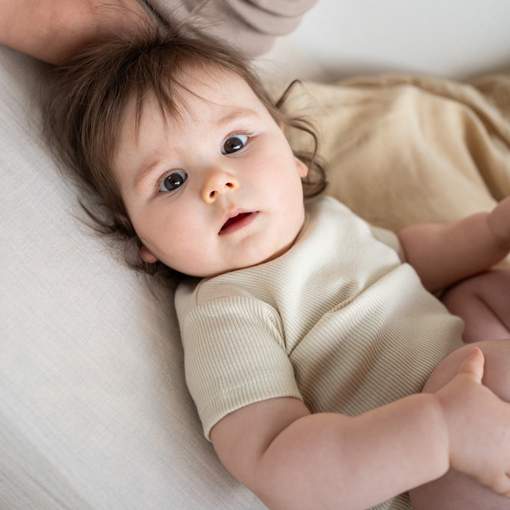 Dejlig kortærmet body i økologisk rib. Halsåbningen åbnes med to nikkelfri YKK-trykknapper.