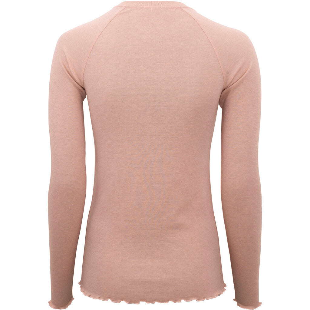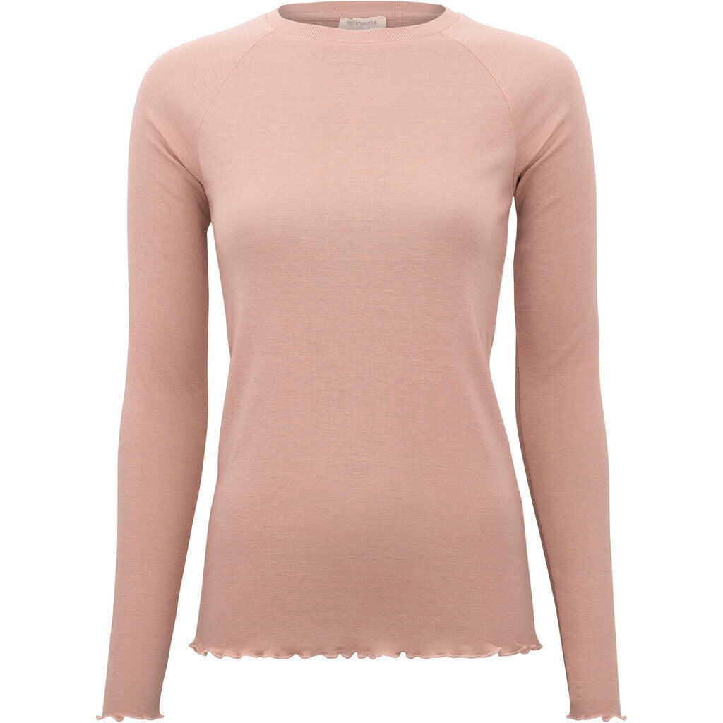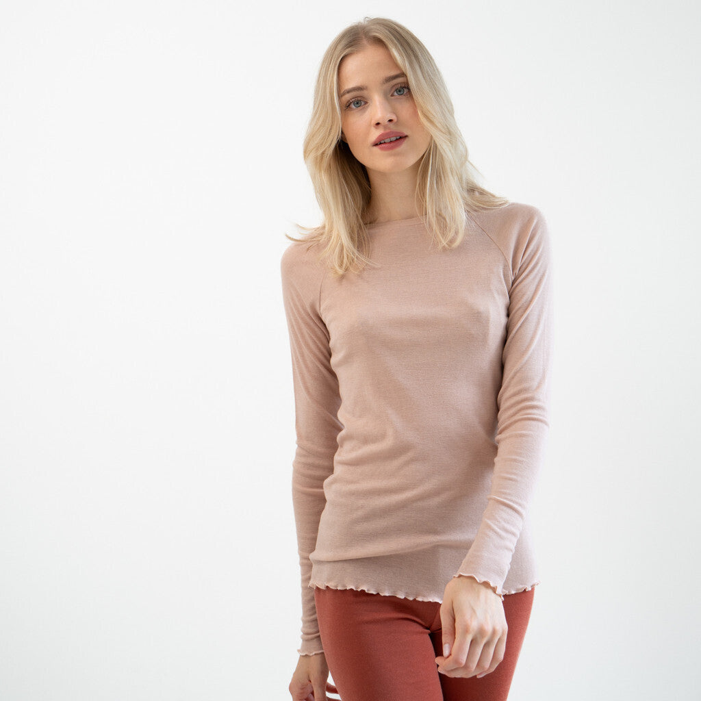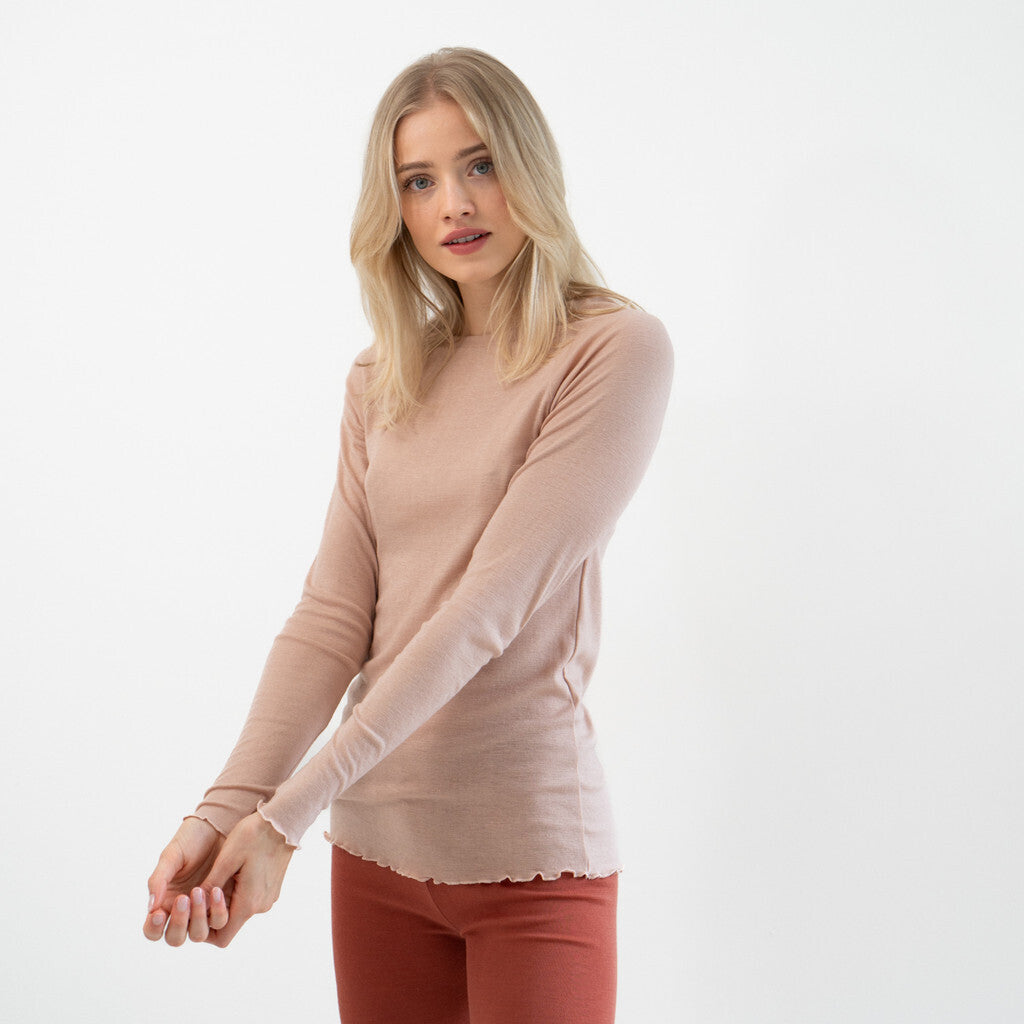 Tate-blusen er en langærmet crewneck med raglanærmer. Den er lavet i en blød og strækbar uld-silke blanding med lodrette brede ribdetaljer.
