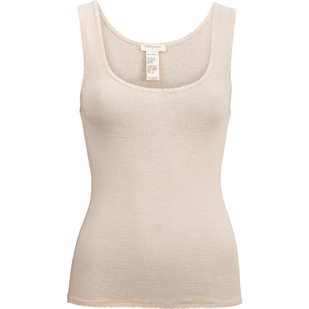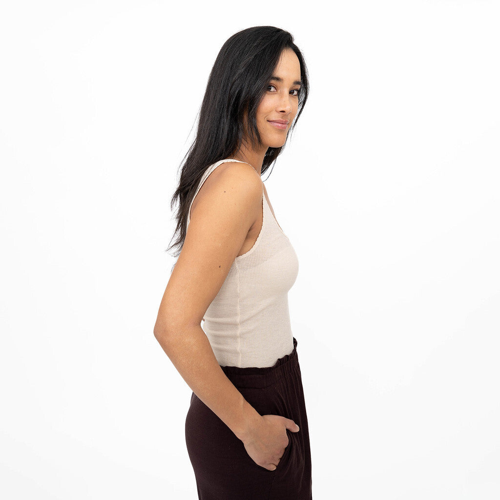 Fremstillet med en luksuriøs blanding af uld og silke, tilbyder denne top en blød og åndbar følelse mod din hud. Den lave halsudskæring tilføjer et strejf af allure, hvilket gør den til et ideelt valg at bære under din yndlingsbluse eller kjole.