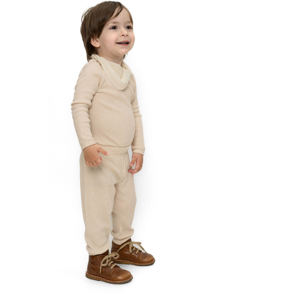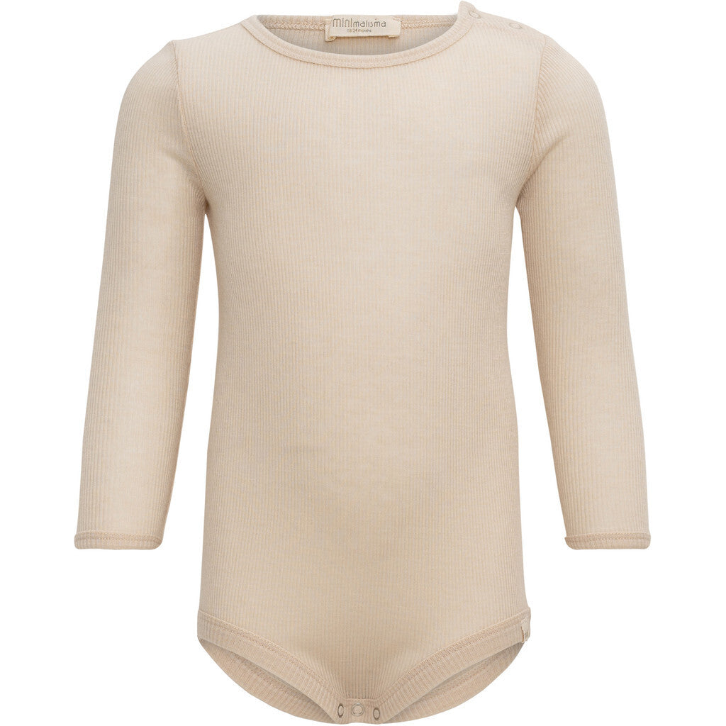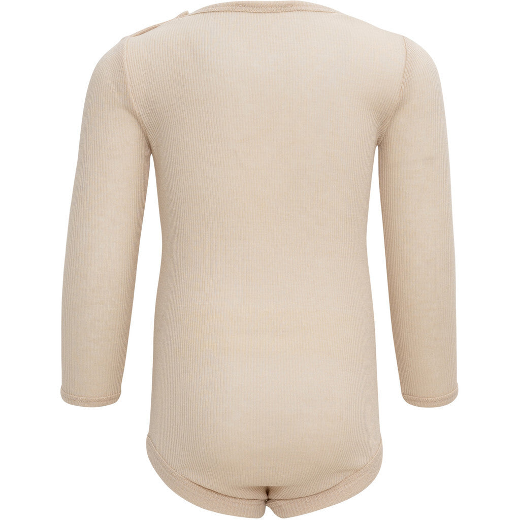 Vores letvægts uld-silke blanding rib jersey romper, designet til babyer op til 2 år.