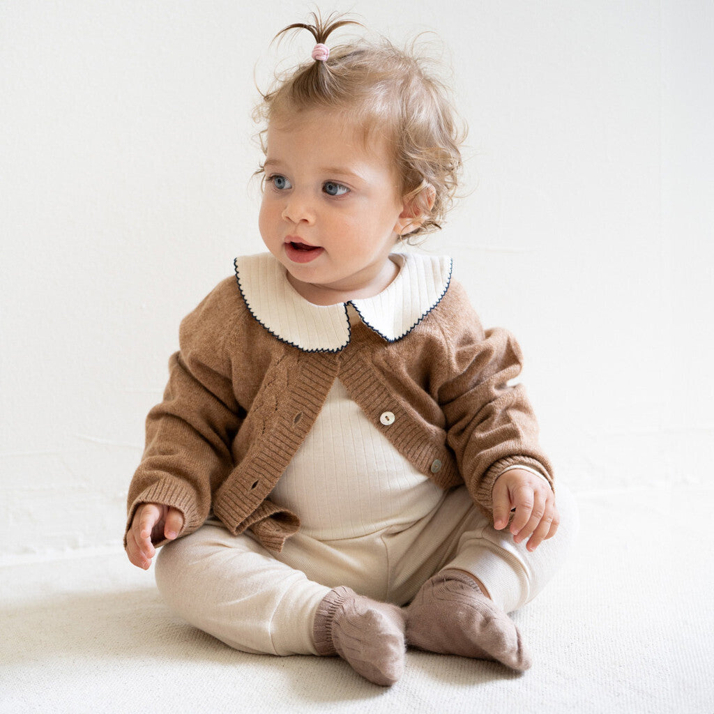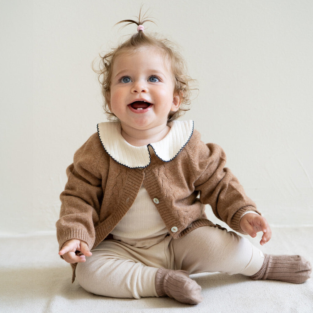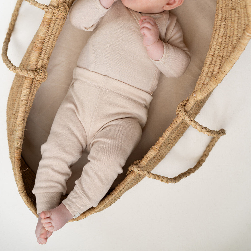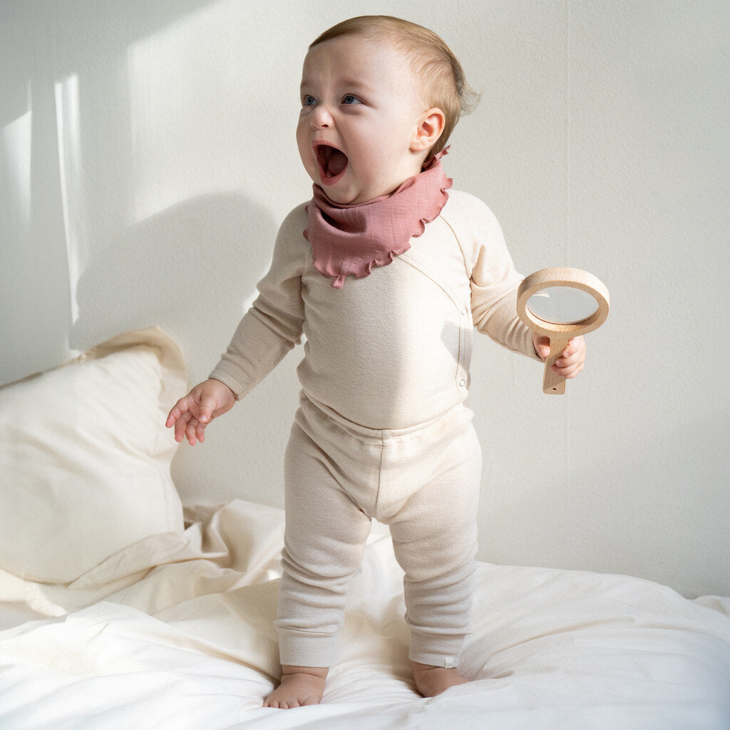 Vores bløde uld-silke jerseybukser tilbyder en blød og hyggelig følelse mod din lilles sarte hud. Den elastiske talje giver en behagelig og justerbar pasform, der tillader nem bevægelse og leg.