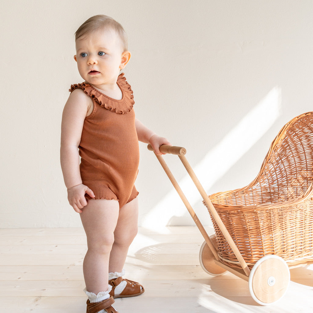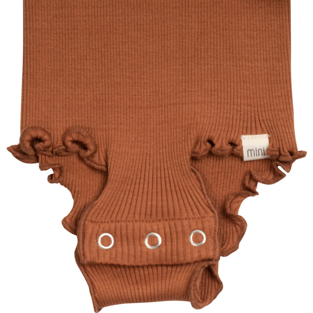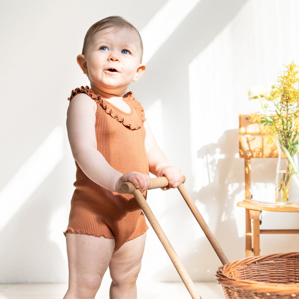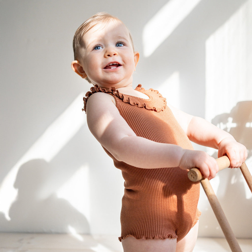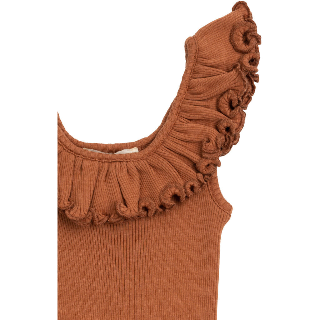 Ärmelloser Body mit Rundhalsausschnitt aus dehnbarer, weicher, nahtloser Seide. Sehr flexibel und schmiegt sich sanft an den Körper an. Mit hübschen Rüschen am Halsausschnitt und an den Beinabschlüssen.