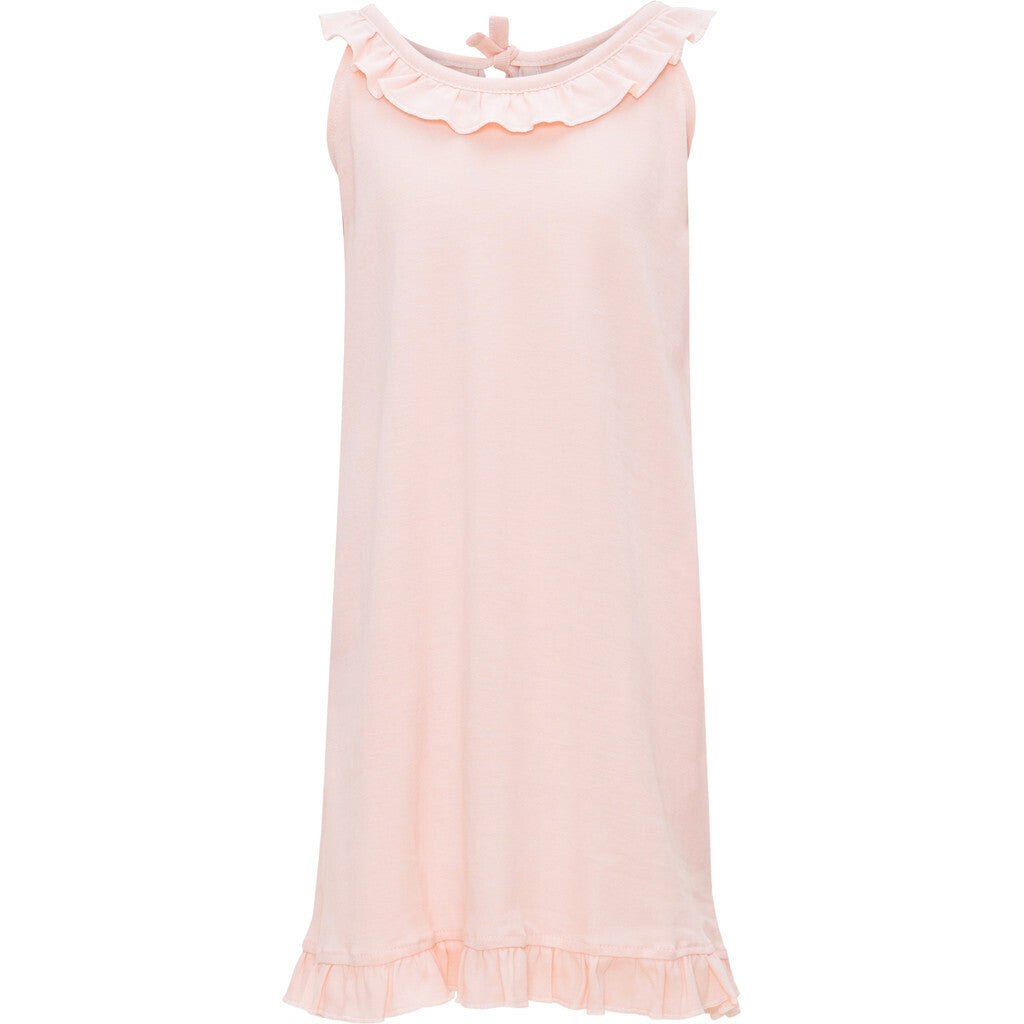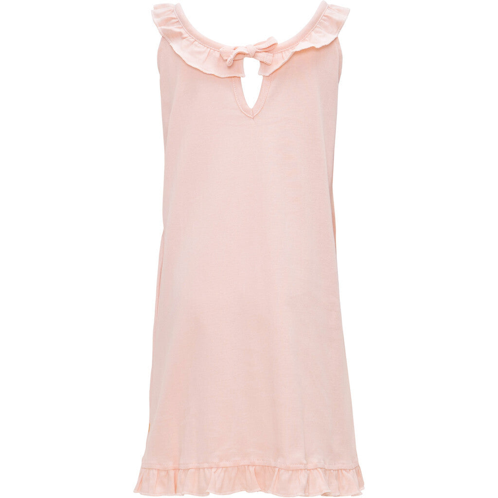 Locker sitzendes Kleid aus weichem, geripptem Bio-Jersey. Das Kleid ist leicht A-förmig und hat Seitentaschen für einen entspannten Look. Mädchenhafte Rüschen um den Hals mit einem Jerseybandverschluss. Kurze Rüschen um den unteren Saum.