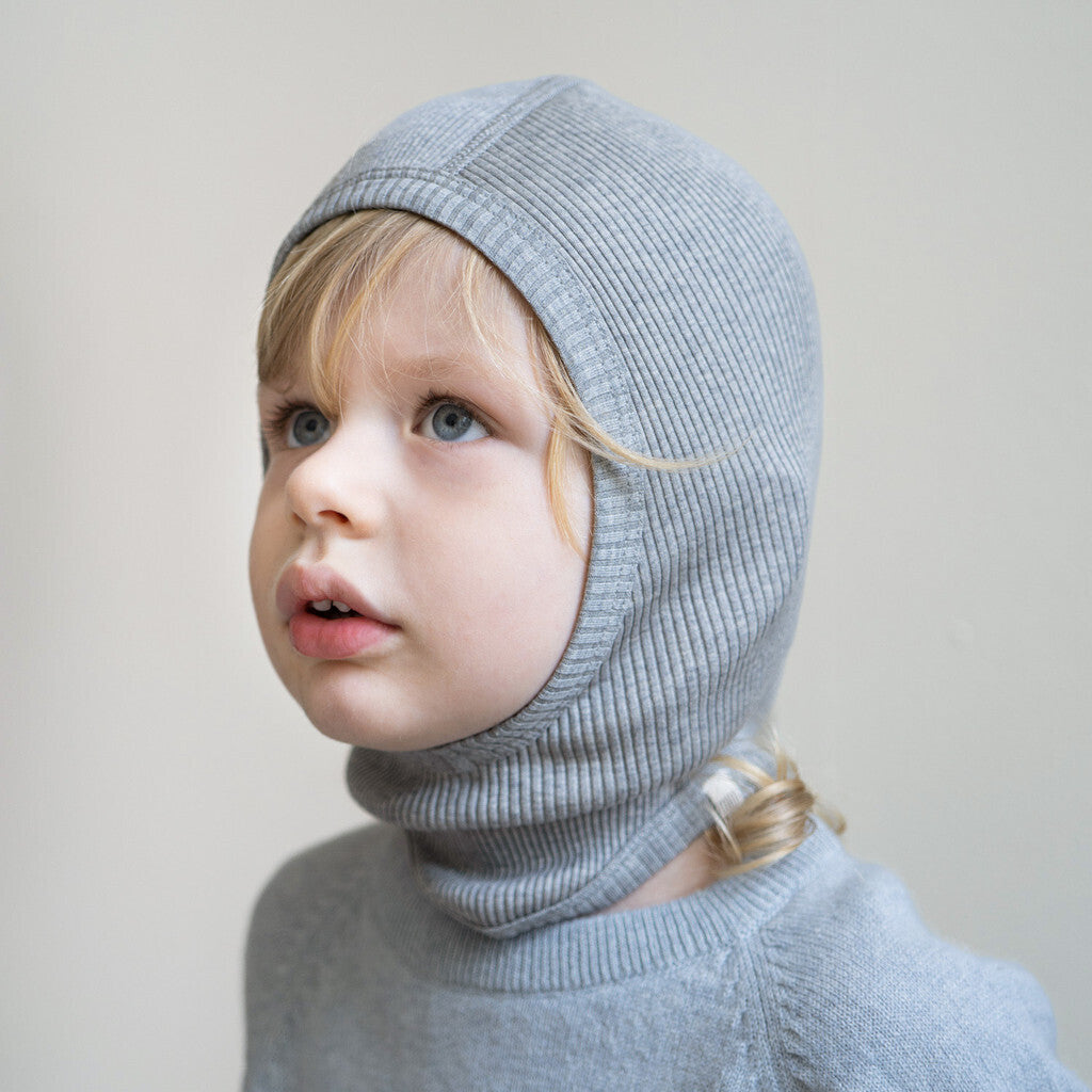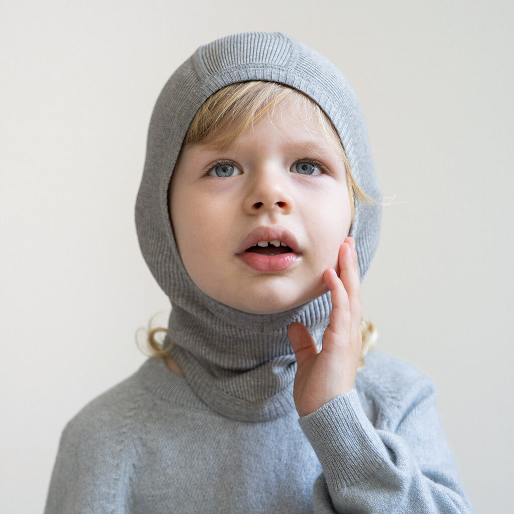 Tricotée dans un mélange soyeux et réconfortant de soie et de coton, cette cagoule côtelée se glisse sans effort sur la tête. Facile à enfiler et à retirer, elle gardera vos petits au chaud et élégants tout au long de l'hiver.