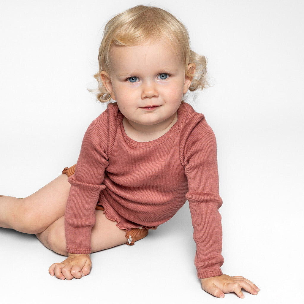 Seamless long-sleeve blouse in soft silk-cotton mix with envelope opening. Rose/Red colours have a frilled rib. All other colours have a unisex double-stitch rib.