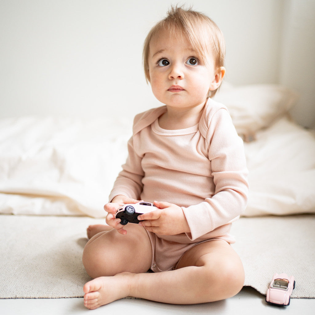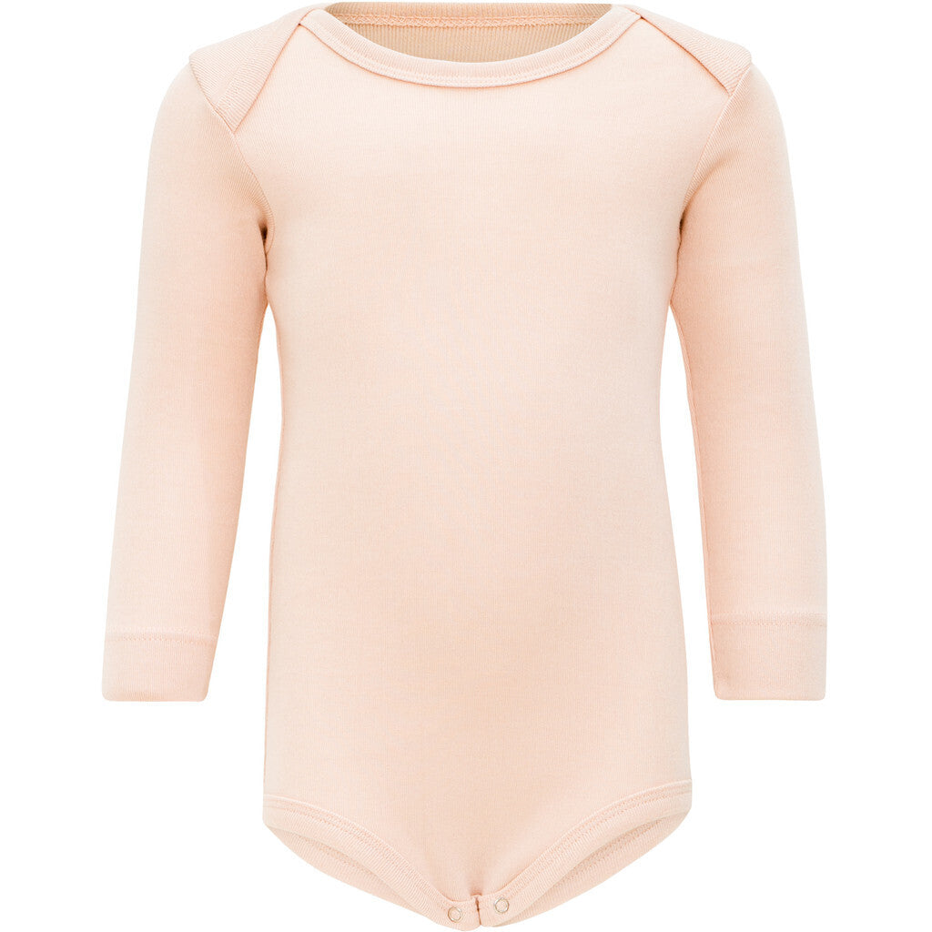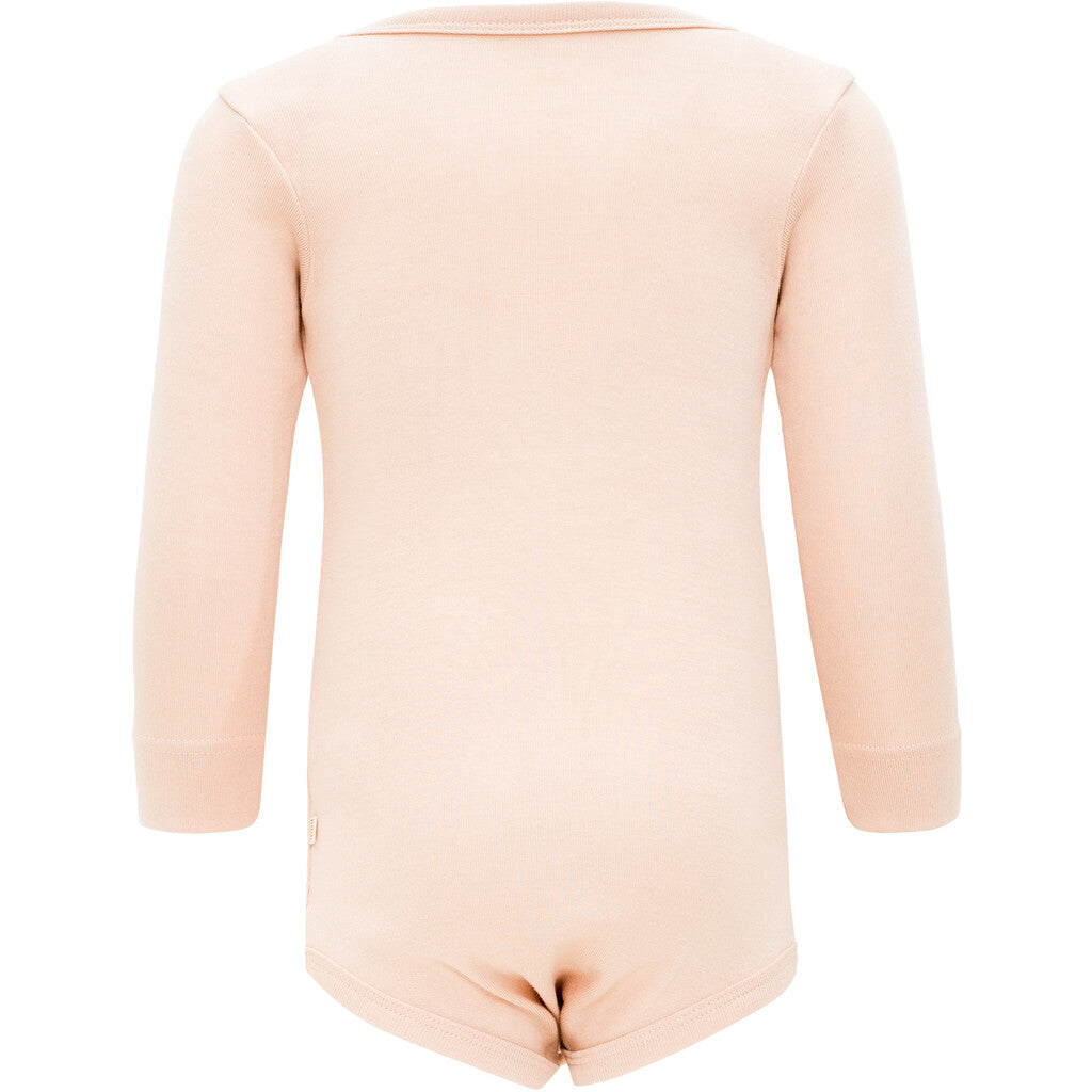 Soft long-sleeve body in stretchable rib jersey with easy-to-dress envelope neck-opening. Sleeves have a folded double stitch. The body comes with YKK popper fasteners; naturally nickel free.