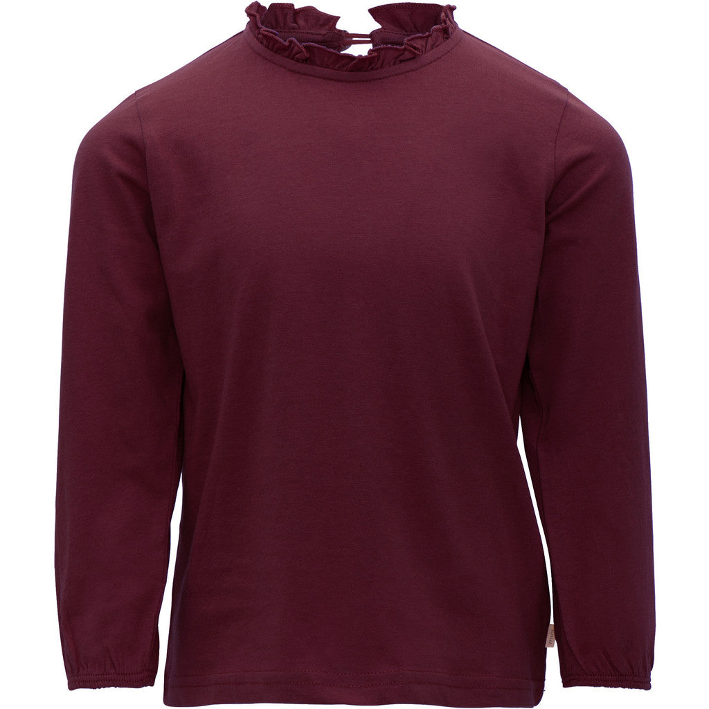 Feminine blouse for girls with short frills around the neck opening and elastic cuffs to add volume to sleeves. Closes in the back with a beautiful mother-of-pearl button. Loose-fit.
