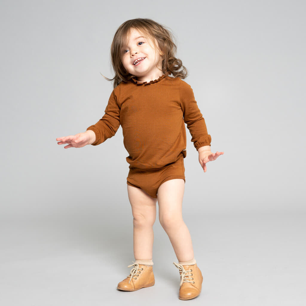 Feminine body for little girls with short frills around the neck opening and elastic cuffs to add volume to sleeves. Closes in the back with a beautiful mother-of-pearl button. Loose-fit upper part and tight lower fitting.