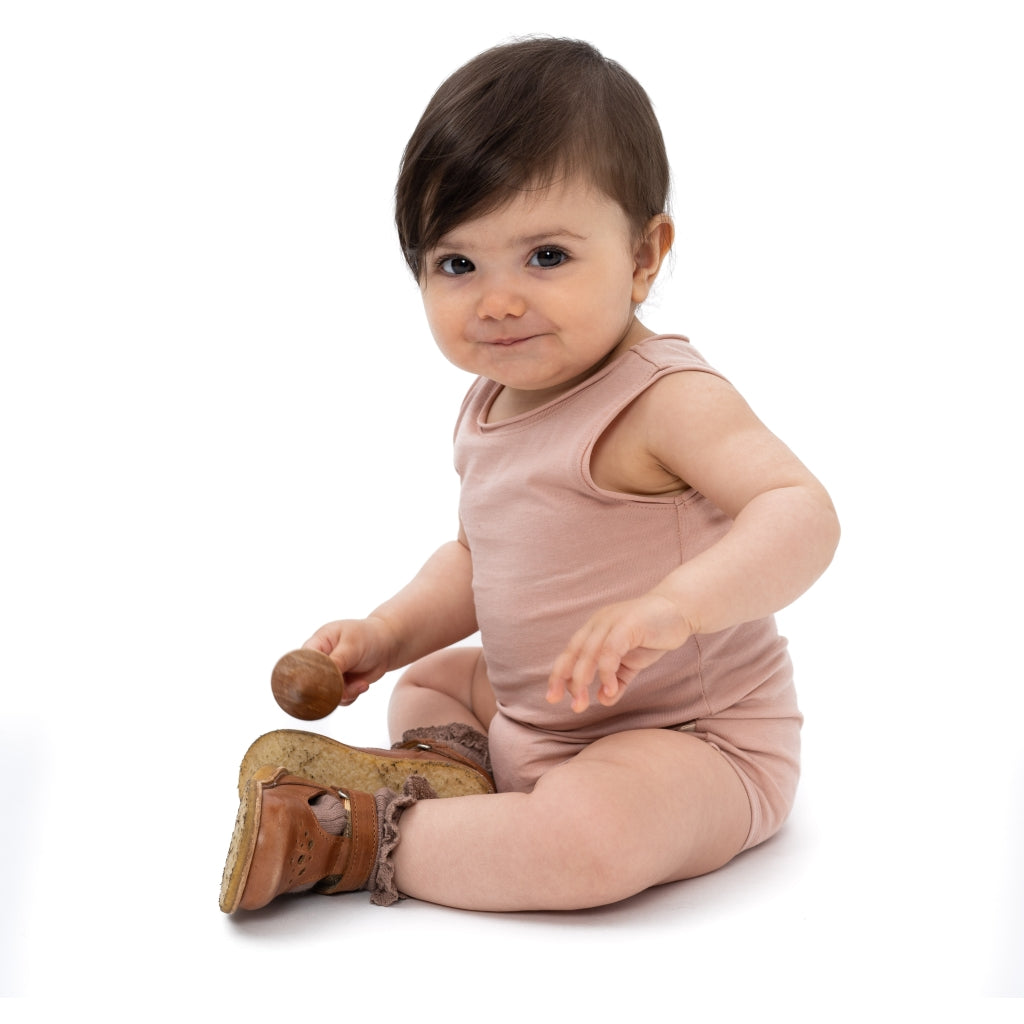 Soft strap-top body in organic cotton. The sleeve- and neck-opening have rolling raw edges. The body comes with two YKK popper fasteners; naturally nickel free.