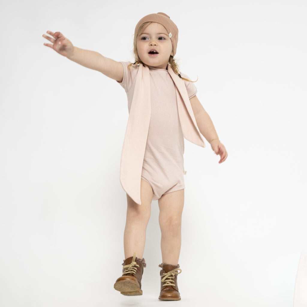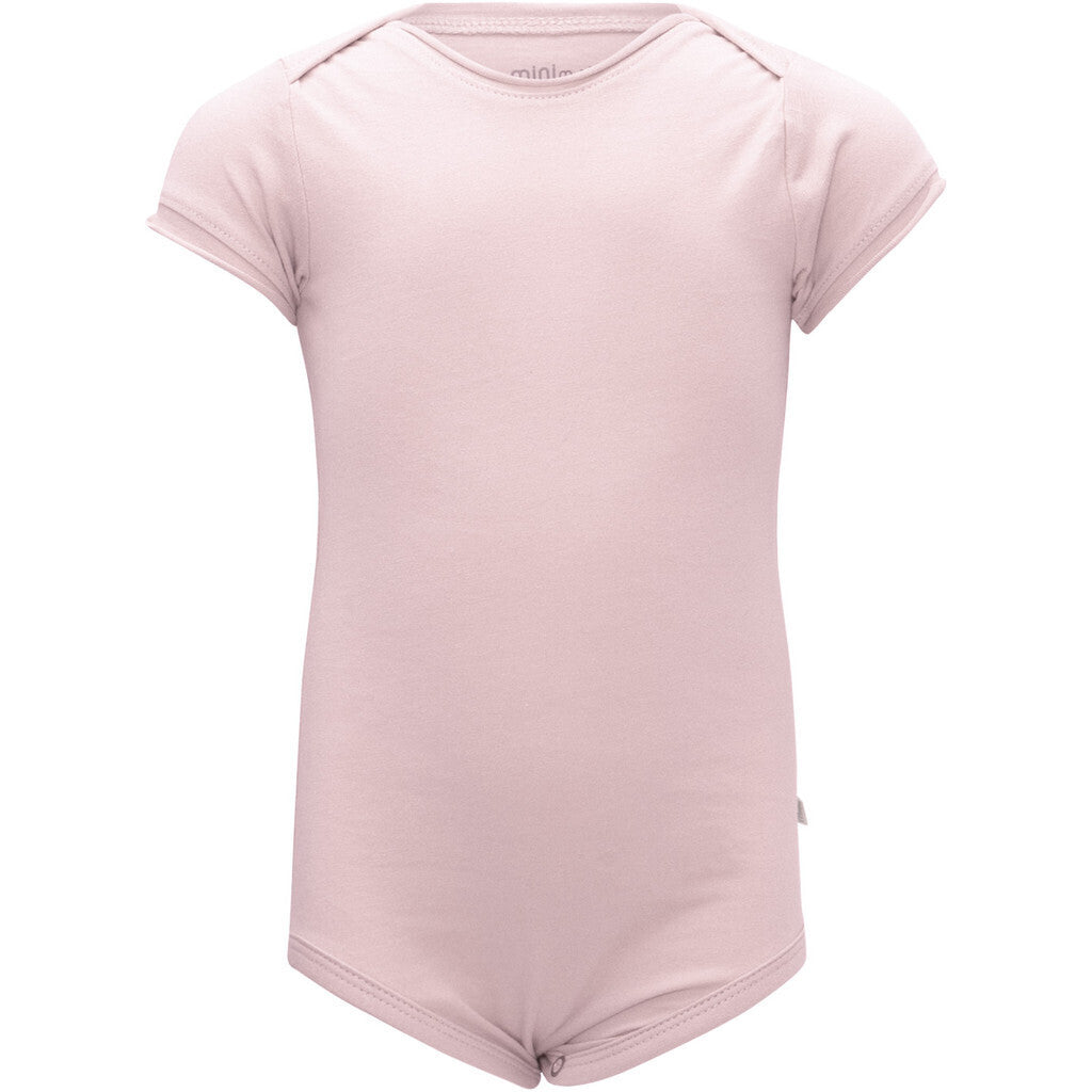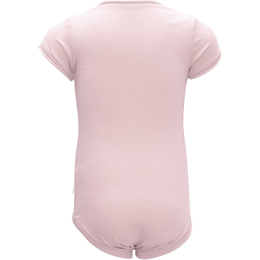 Soft short-sleeve body in organic cotton with envelope neck-opening. The sleeve- and neck-opening have rolling raw edges. The body comes with two YKK popper fasteners; naturally nickel free.