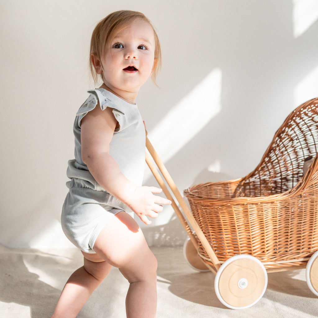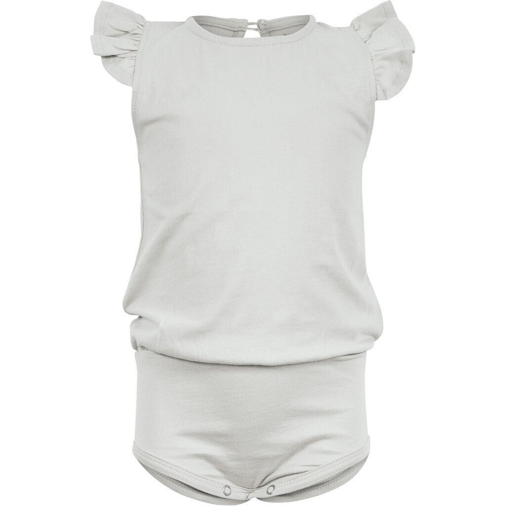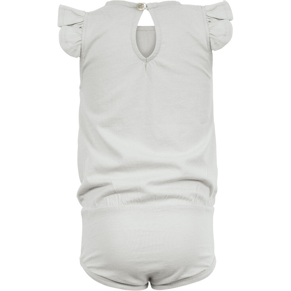 Round-neck volume body in lightweight organic cotton with frills at the shoulder for a girly look and added sun protection for sensitive shoulders. A single mother-of-pearl button in the back of the neck for easy dressing. Upper part is full volume with a soft waist and a slim fit from waist down. Perfect as romper or styled with a skirt or pants.
