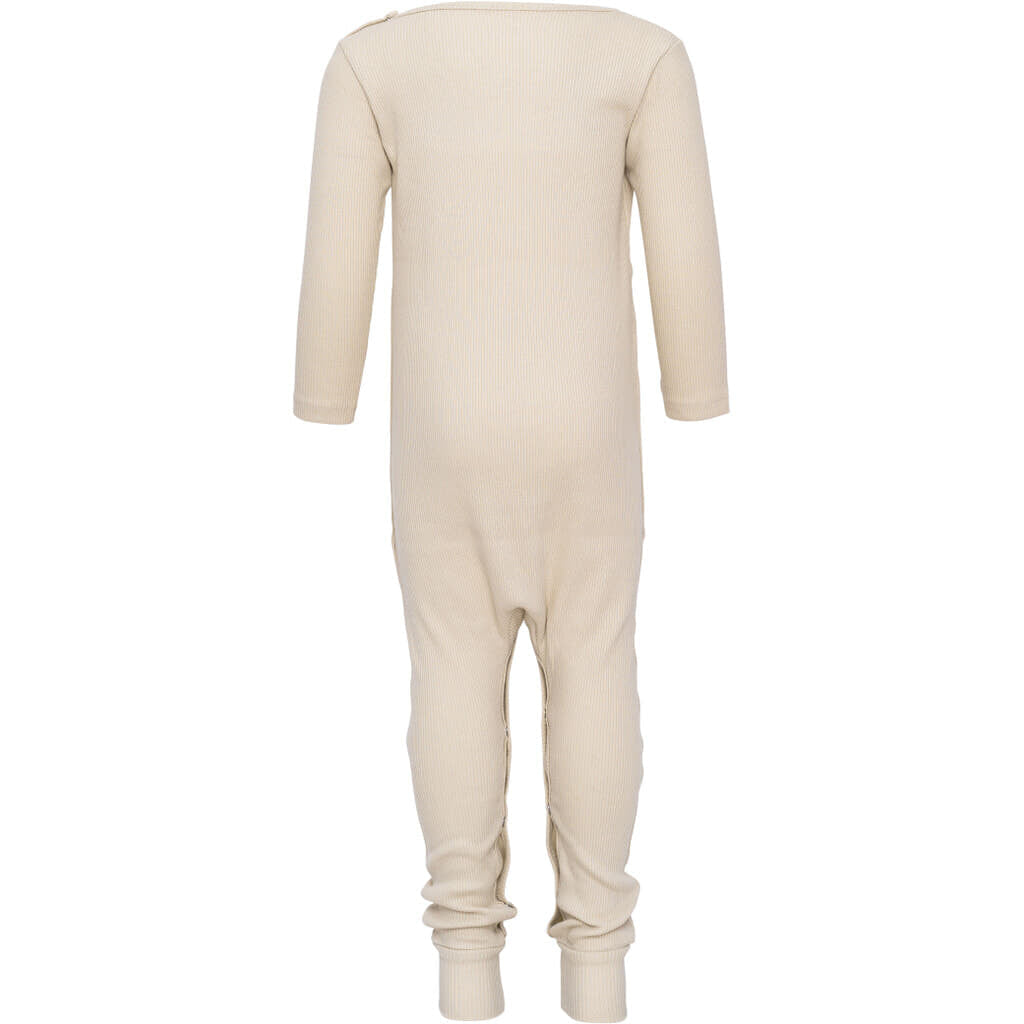 Soft pyjama / jumpsuit in organic cotton rib with long sleeves. The neck-opening opens with two nickel free YKK-snap buttons. The leg-cuffs are closed so that only the inseam is with YKK snap buttons; for easy dressing.