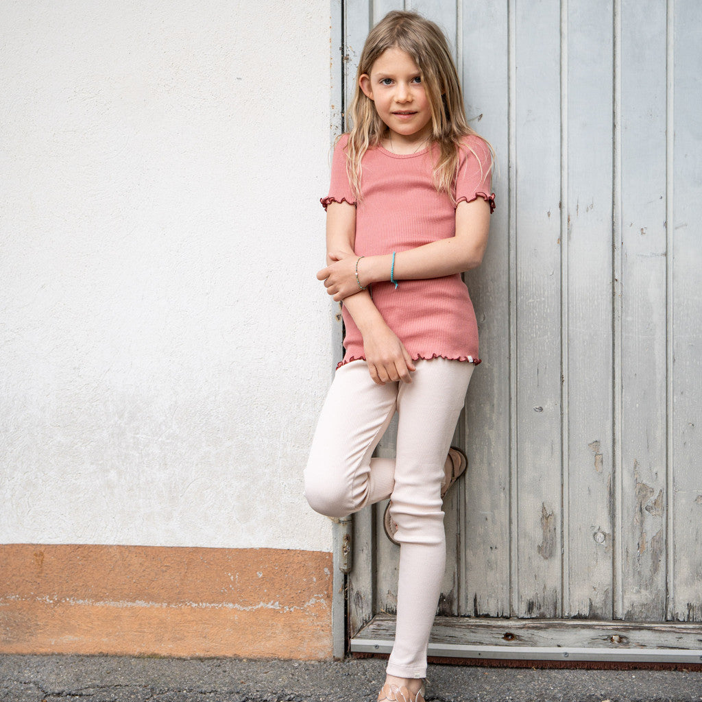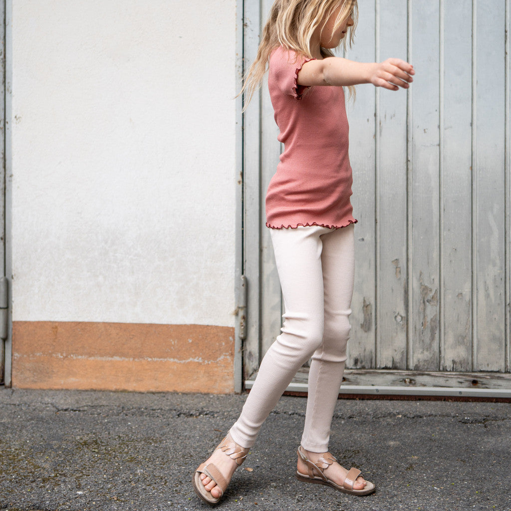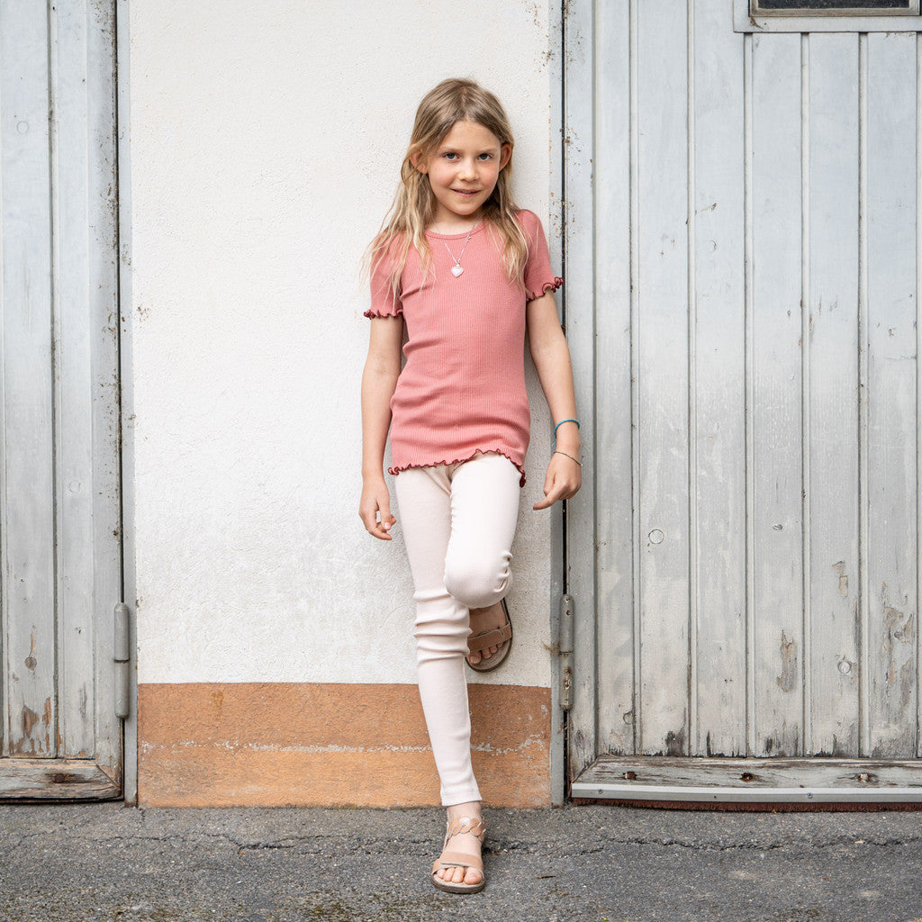 Comfortable and soft leggings in organic cotton rib jersey. The leggings have a flexible elastic waist and are suitable for both boys and girls.